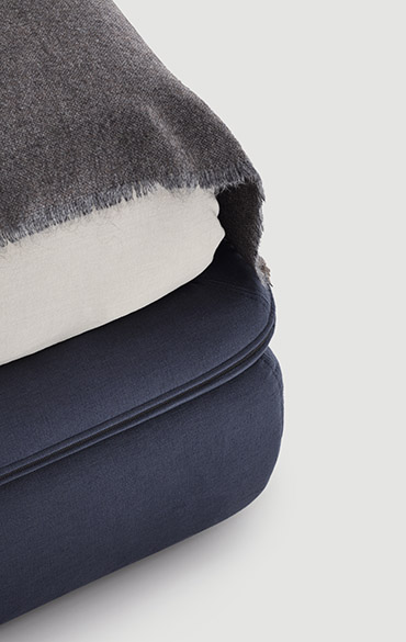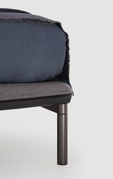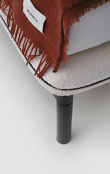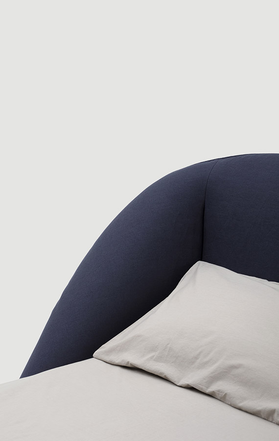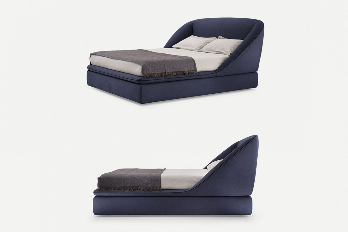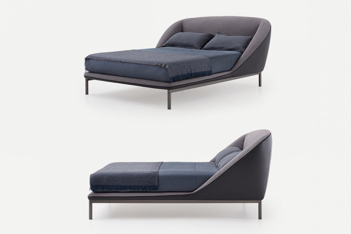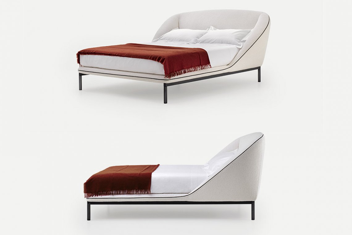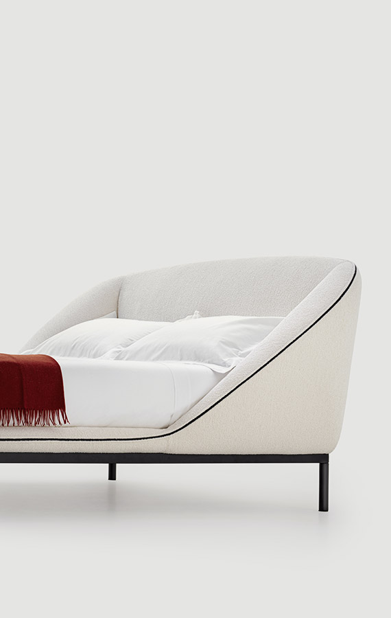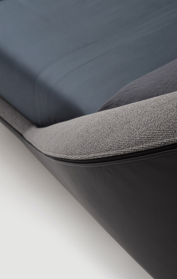 As a tribute to Sunday, the day of rest, the Domenica bed invites you to relax and recline in a solid, warm and protective embrace. A bed where you can relax, read and recline at leisure, gently cocooned by the soft shapes of a structure that creates a safe, intimate corner. One single continuous line draws a delicate, organic silhouette. The exposed zip, is a key feature of the bed profile, transforming the zip from a functional element to a distinctive detail. The bed contour widens majestically and then curves downwards in a sharp diagonal as if to close the shape in order to protect, conceal or shelter. It is more than a bed. It is a place and to some extent also a piece of interior architecture conceived as a place to set one’s emotions at rest. The metal base adds further lightness to the structure, giving it the appearance of floating in space. There is an optional underbed container for better organisation of storage.