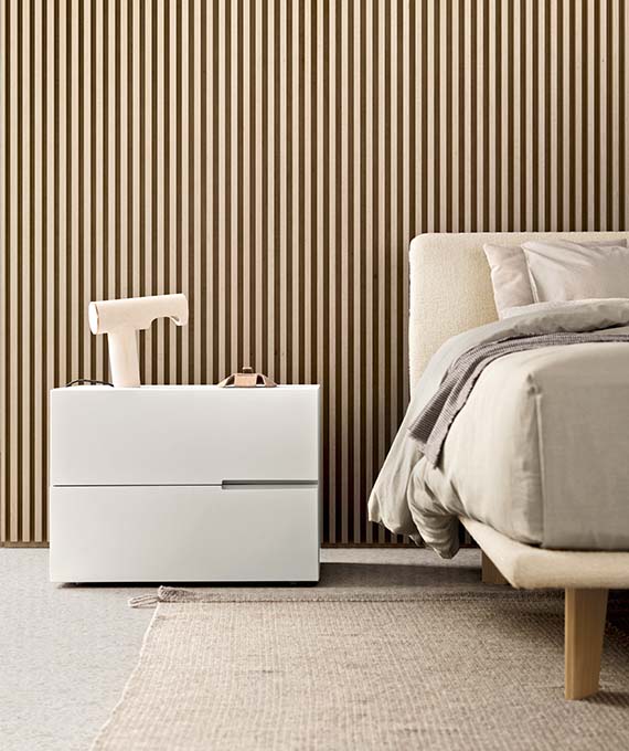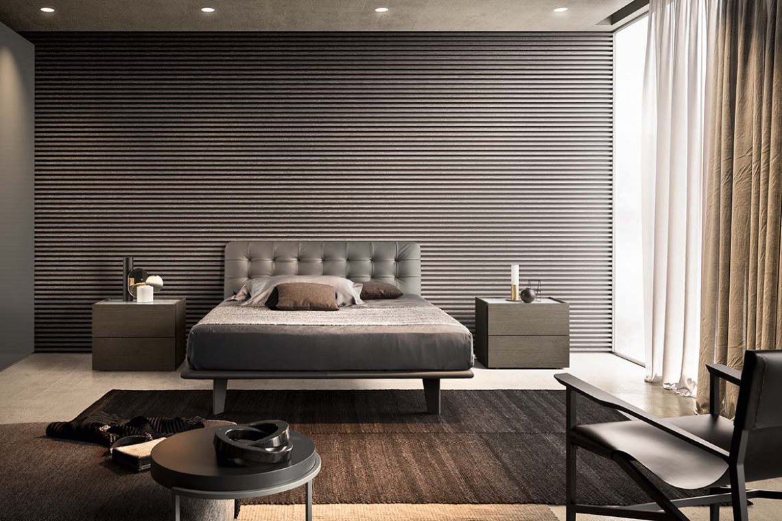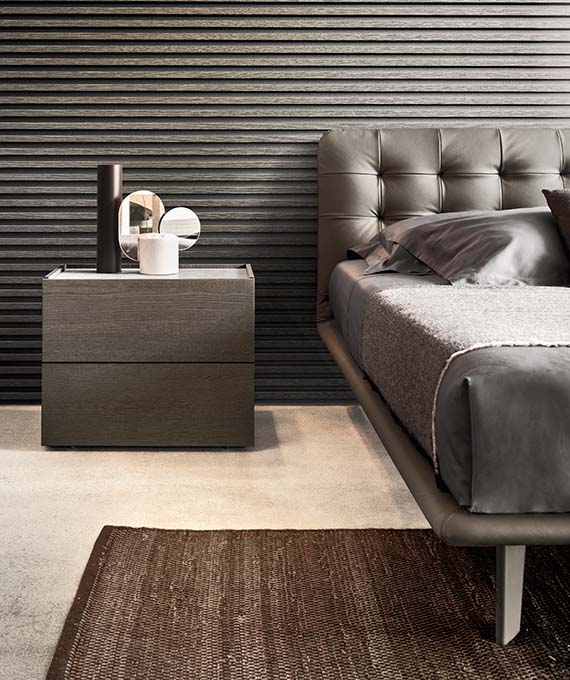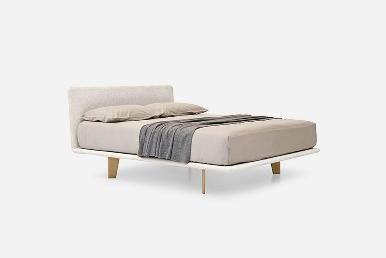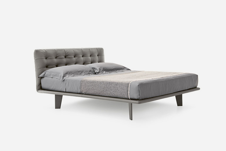 Versatility is an additional asset for this bed. Its minimalist design and moderate dimensions let it discreetly and elegantly adapt to any environment. Like an uninterrupted seam, the fully-upholstered headboard and bed base frame create a single, continuous shape. The padded headboard is upholstered in hand-tufted or plain leather or fabric. The straight, almost two-dimensional feet are available in Plexiglas, wood and matt lacquers.