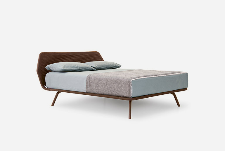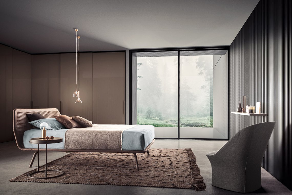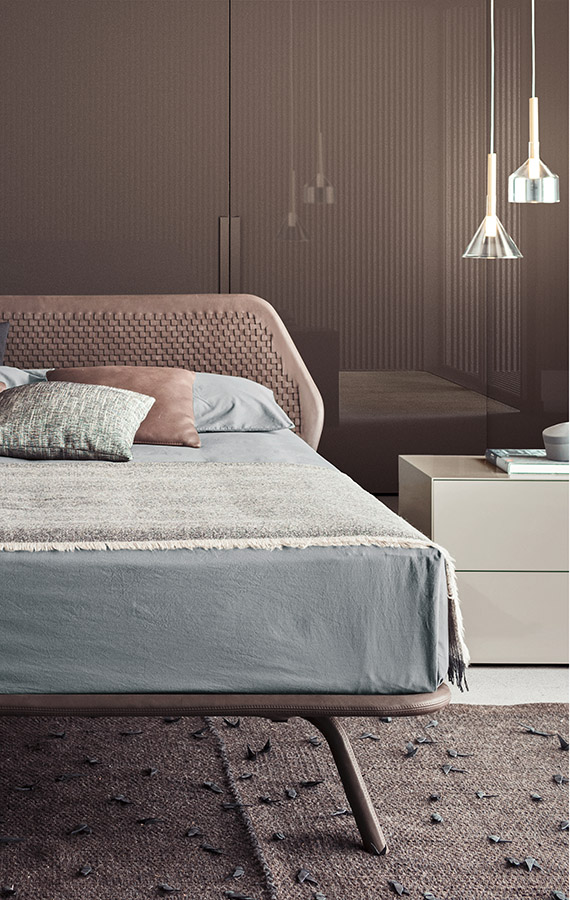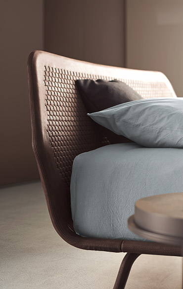 Sophisticated atmospheres take shape thanks to the skilled dexterity of expert craftsmen. The headboard, completely covered with hand-woven leather, is a real eye-catcher. The result is a refined pattern made up of slim strips arranged at right angles. Accurate seams impeccably sew together the upholstery of the entire bed frame. Seamless results enhance the expressive qualities of leather and the features of a design with a modern soul that expresses itself through refined details.