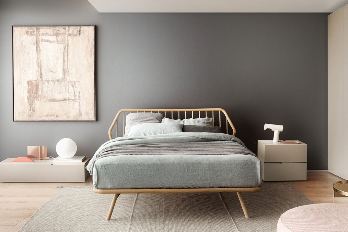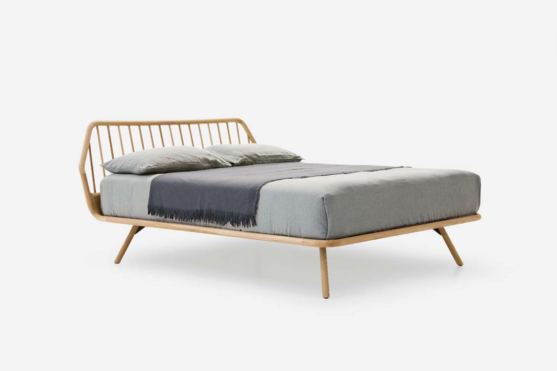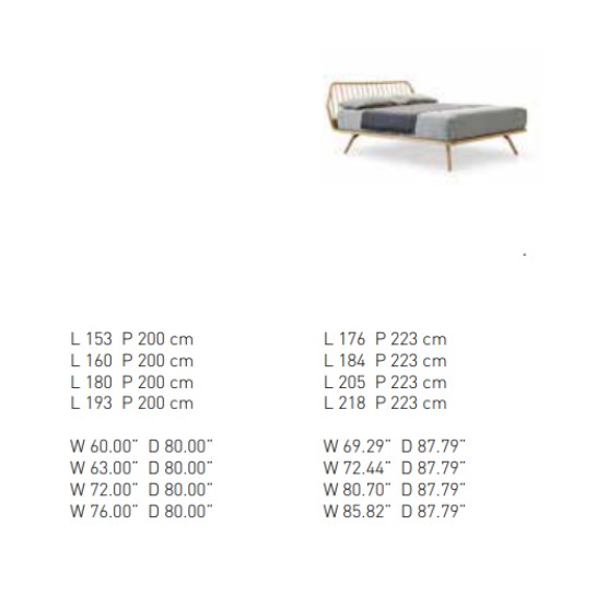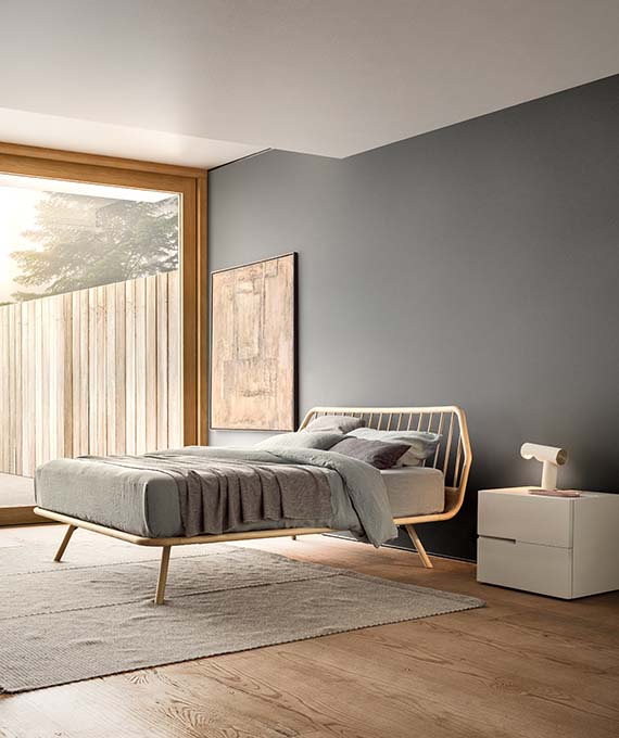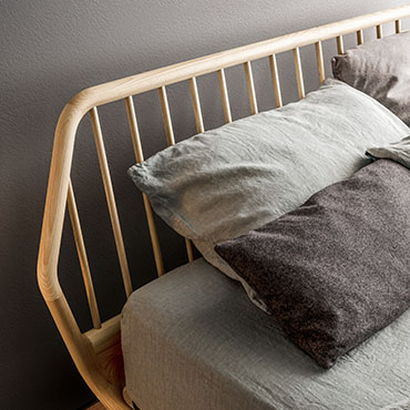 Minimalism reveals a sensational character. A modern interpretation of the classic four-legged bed; its fresh design boasts clear, clean-cut, lines. The leitmotif consists of an interplay of slanting boards which gives the whole frame an almost graphic appeal. The bed base frame and the headboard form a single, seamless and dynamic profile that enhances the solidity andnatural beauty of the handcrafted solid wood. The same material and forms are picked up on the feet.