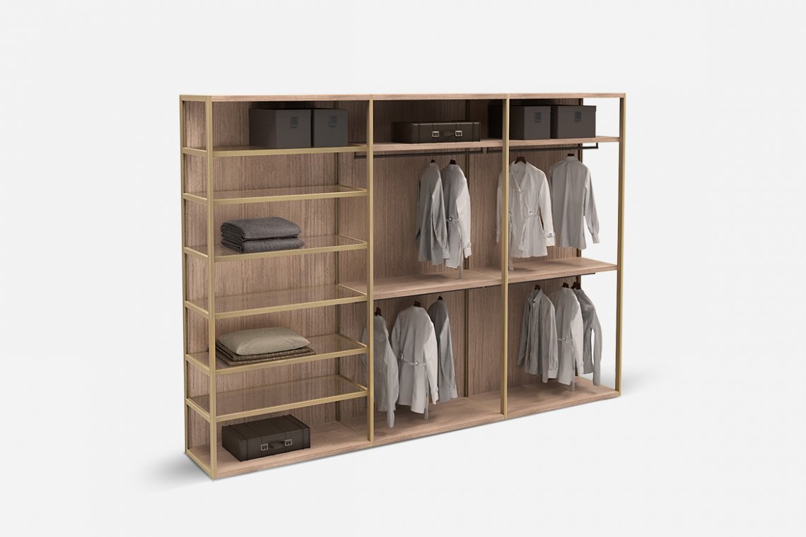 Transparency, lightness, linearity. The new Teatro walk-in closet was designed to create a subtle frame for everything it contains. The essential, elegant supporting structure becomes a visible, distinctive geometric form, perfectly suited to any environment and style. The passing frame dividers, with no interior panels, ensure visual and spacial continuity, emphasising the lightness of the architecture. The free-standing structure allows the walk-in closet to be fitted against a wall, without anchoring, or in the centre of the room, making Teatro a window display or an island, suitable not only for private spaces, but also contract spaces. Adding back panels, side panels and doors in transparent or reeded glass gives plenty of scope for a custom design, whatever the style and functional requirements.