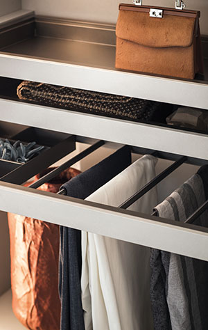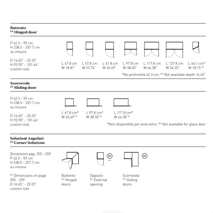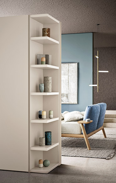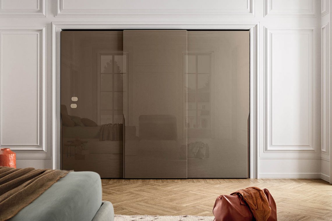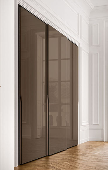 A fresh, modern design inspired by the contemporary lines of minimal aesthetics. The sophisticated shape of the handle – consisting of a vertical groove in the door edge and of an inner surface that can be customised in lacquered, metallic and wood finishes – is reminiscent of the tapered profile of a wing. The doors come in an even wider range of finishes, available in glass, mirror, wood and lacquer, coordinated with or differing from the handle for a tone-on-tone or contrasting effect.