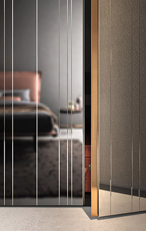 Lush, eccentric and elegant, embellishments steal the show. Vertical incisions run across the surface of the door, alternating like discontinuous rays of light that sketch dynamic, parallel lines. Gloss or matt, they beautify the glass or mirrored door surfaces. The handles run along the whole height of the inner door edge and come in a lacquered aluminium or metallic finish.