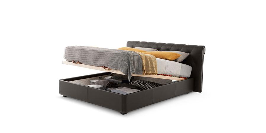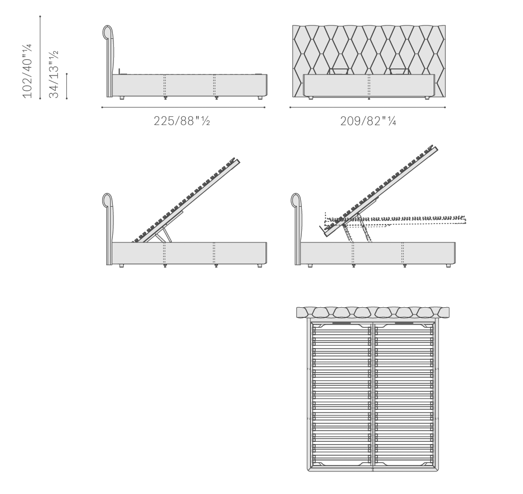 Bluemoon床的床頭結(jié)構(gòu)使用楊木和櫸木實木,略微填充不同密度的聚氨酯泡沫和聚酯棉?;矙诓糠质褂蒙寄緱l,床腳板部分使用楊木膠合板,略微填充聚氨酯泡沫和聚酯棉。支腳為圓柱形,使用黑色噴漆鋁。Bluemoon床可以容納一只大容積收納倉,通過空氣彈簧裝置從前側(cè)床腳板處打開。該版本中,基座前方配有肌理黑色噴漆櫸木支腳,床頭側(cè)配有2個輪子,方便移動。