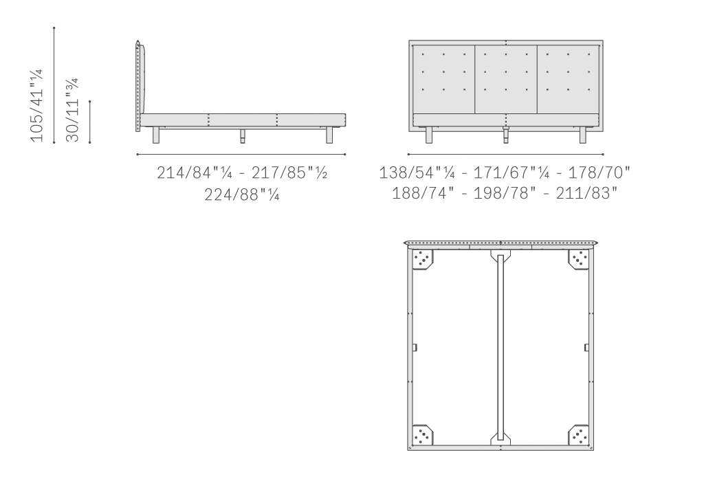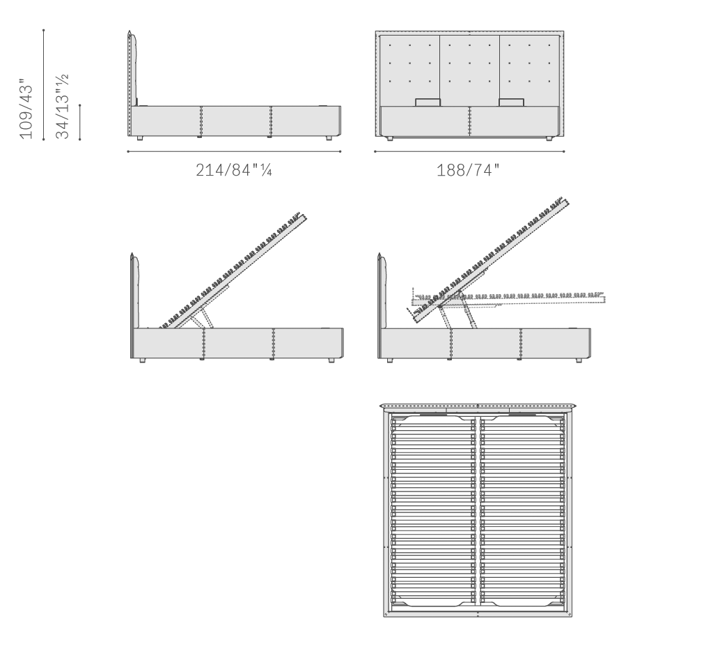 GranTorino Coupé Bed床的床頭結(jié)構(gòu)為樺木膠合板,柔軟的絎縫包墊中填充聚酯棉。床欄使用杉木條,床腳板使用楊木膠合板,略微填充聚氨酯泡沫。GranTorino Coupé Bed覆層使用Pelle Frau?軟皮,將皮革與軟皮或布藝相結(jié)合以及將軟皮和布藝相結(jié)合的版本中,則是:床頭后側(cè)和床架使用Cuoio Saddle Extra皮革或Pelle Frau?軟皮,絎縫覆層使用Pelle Frau?軟皮或可拆洗布藝。使用對(duì)比色縫線手工制作的精致X型縫線令絎縫表面更加豐富。皮革版本使用突出縫線,齊整剪裁的皮革手工縫合。圓柱形鋁制支腳覆蓋Pelle Frau?軟皮或黑色噴漆。Gran Torino Coupé Bed床也提供搭配收納倉(cāng)的版本。開(kāi)啟系統(tǒng)允許通過(guò)兩種不同方式打開(kāi)收納倉(cāng)。除了常見(jiàn)的垂直升高床面之外,還可水平升高,便于整理床鋪。兩種機(jī)械系統(tǒng)均配備安全止動(dòng)。收納倉(cāng)基座采用中密度木質(zhì)纖維板。