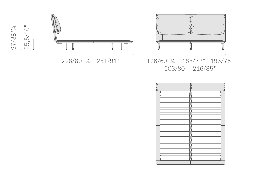 John-John Bed床的床頭結(jié)構(gòu)為櫸木和楊木實(shí)木,墊有中密度木質(zhì)纖維并填充聚氨酯泡沫。靠墊填充鵝絨和聚酯棉,通過(guò)Pelle Frau?軟皮覆層與結(jié)構(gòu)連接。床架使用櫸木和楊木實(shí)木,填充聚氨酯泡沫,用于容納專門為它準(zhǔn)備的床面,后者由掛接在中心橫撐上的一系列櫸木板條組成。Poltrona Frau?板條套件分為兩種版本,硬質(zhì)版本或腰部可調(diào)版本。鍍釕表面處理鋁制支腳。John-John Bed外覆Pelle Frau?軟皮。