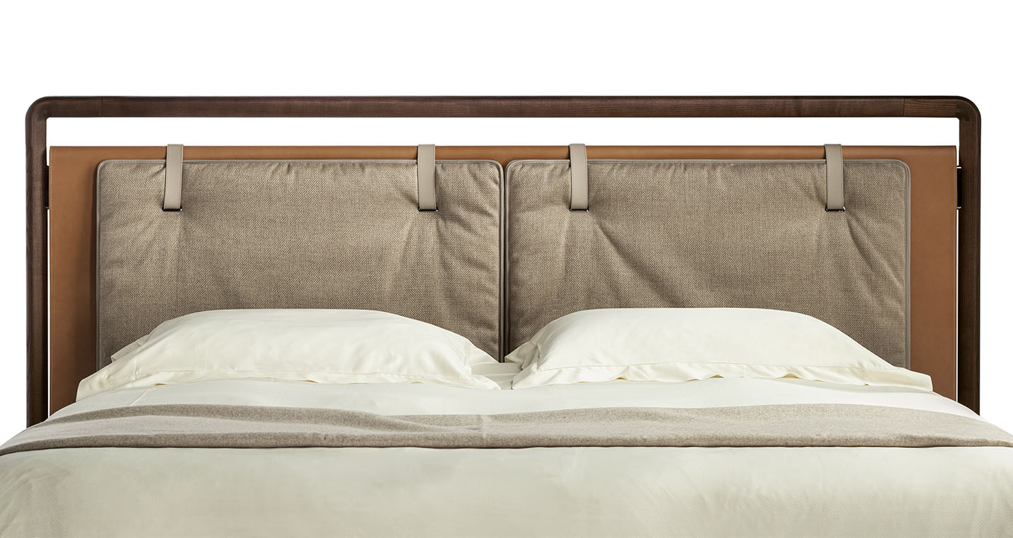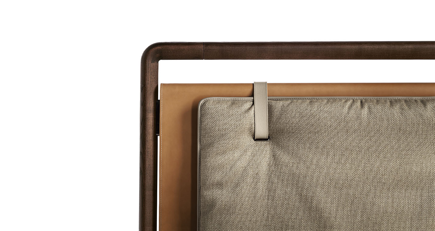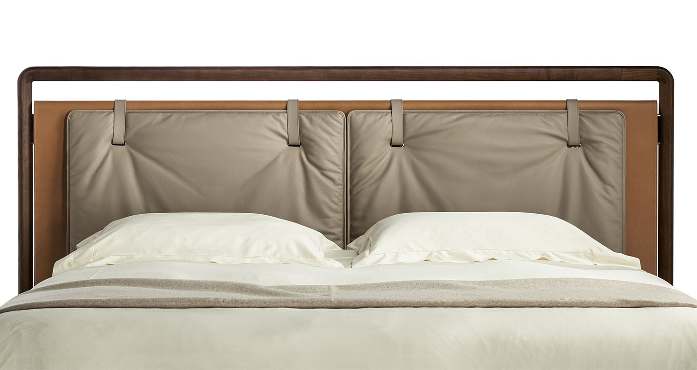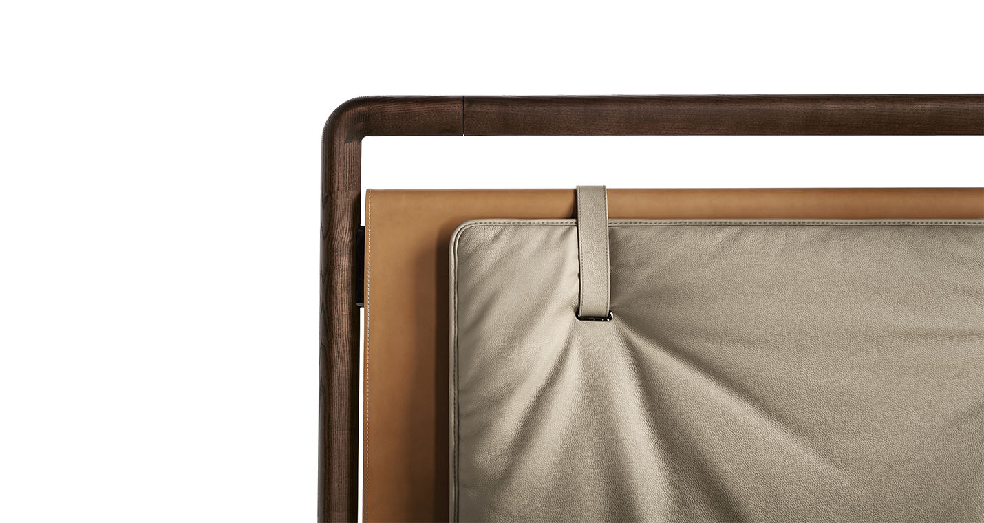 兩個豐滿而鬆軟的聚酯棉和棉帆布填充靠墊,透過兩條軟皮帶連接在床頭上。床頭前側(cè),皮帶穿過槍管色表面處理金屬孔眼,通過扣子固定在后側(cè),扣子也使用槍管色表面處理,有Poltrona Frau標(biāo)志。靠墊覆層使用Pelle Frau?軟皮,也可選擇布藝,周邊軟皮滾邊裝飾。