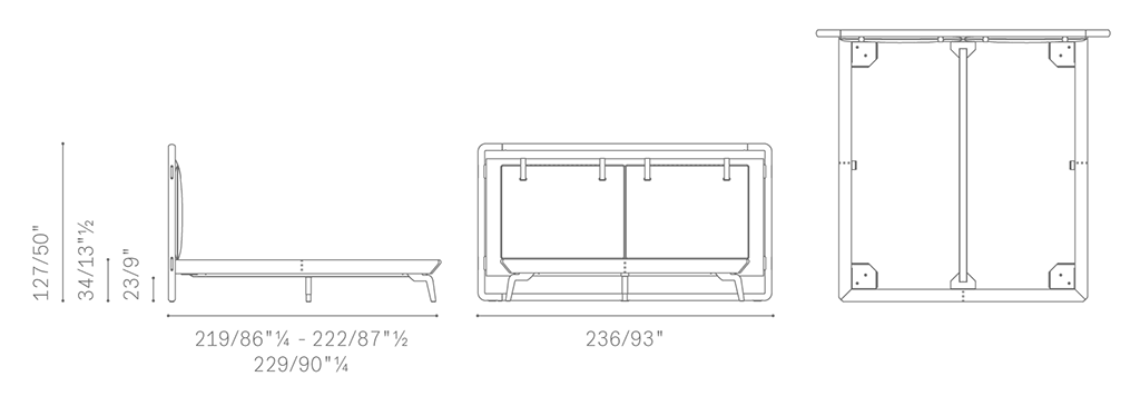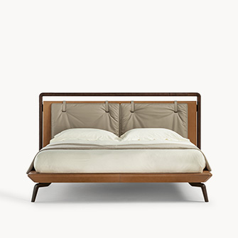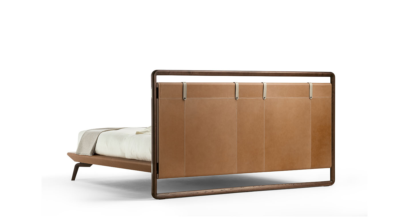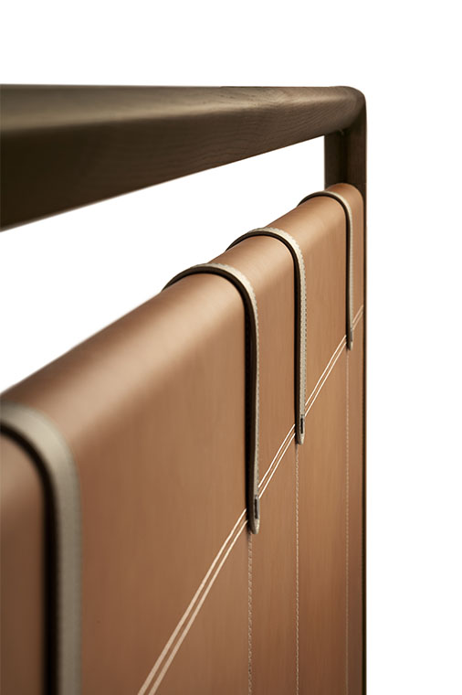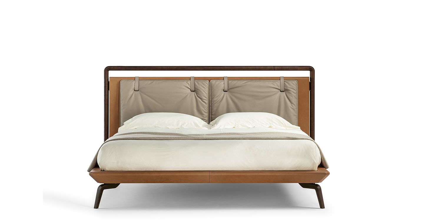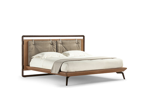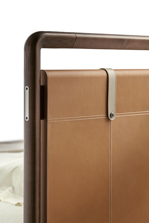 兩個豐滿而鬆軟的聚酯棉和棉帆布填充靠墊,透過兩條軟皮帶連接在床頭上。床頭前側(cè),皮帶穿過槍管色表面處理金屬孔眼,通過扣子固定在后側(cè),扣子也使用槍管色表面處理,有Poltrona Frau標(biāo)志。靠墊覆層使用Pelle Frau?軟皮,也可選擇布藝,周邊軟皮滾邊裝飾。