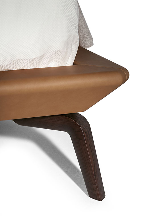 Volare Due床採用三角形截面摩卡色白蠟?zāi)緦?shí)木結(jié)構(gòu)。床腳板和縱向床梁使用北美鵝掌楸,完全包覆Cuoio Saddle Extra革或Pelle Frau?軟皮,床頭使用相同覆層,其結(jié)構(gòu)使用櫸木實(shí)木,內(nèi)部橫撐使用樺木膠合板,墊有美森耐板。床頭板通過槍管色表面處理金屬墊片固定在結(jié)構(gòu)上,墊片由相同表面的金屬板封住。橫樑和中央支腳、角板和擱板均由黑色漆面鋼板製成。