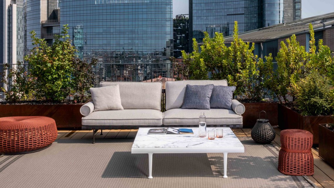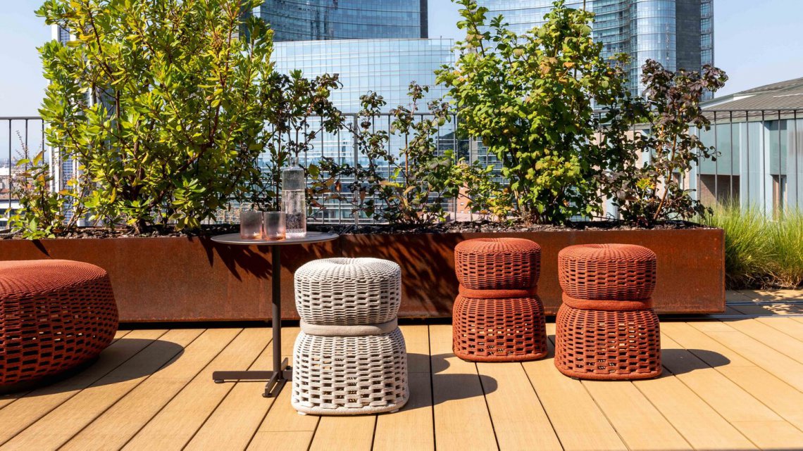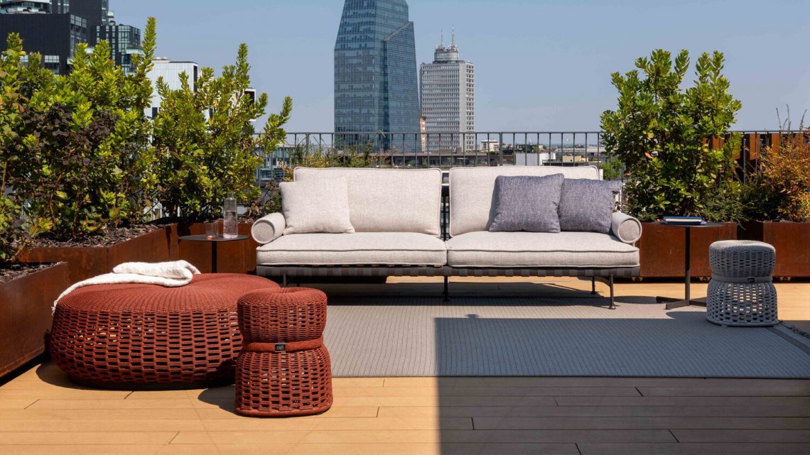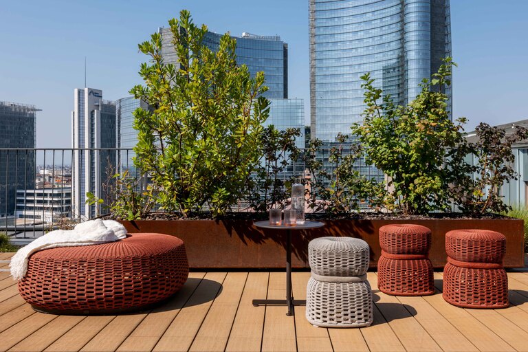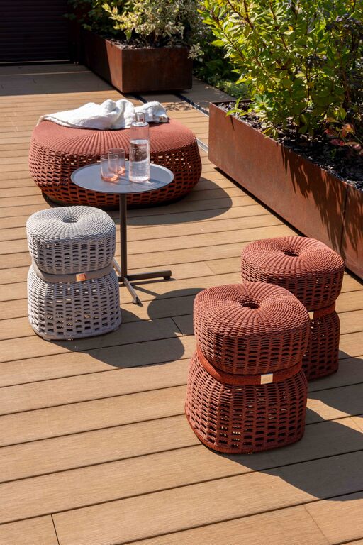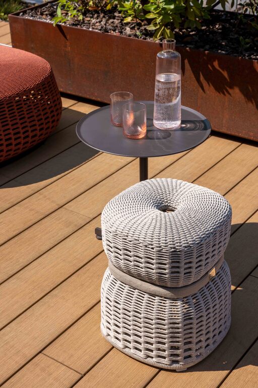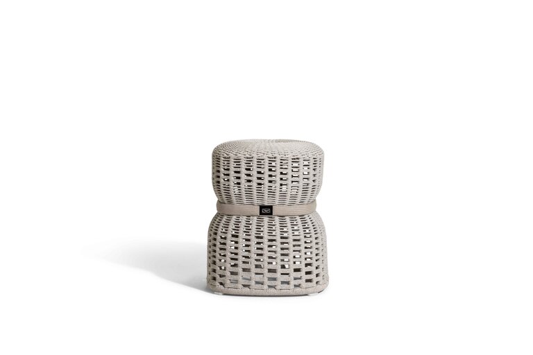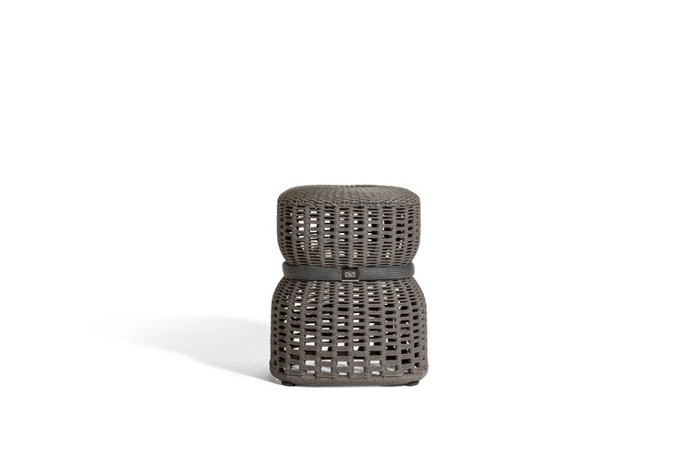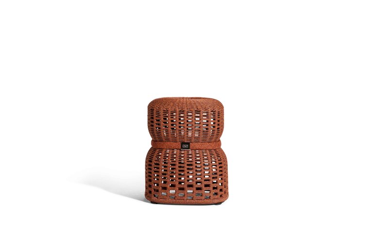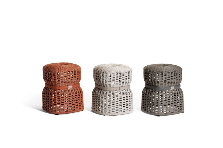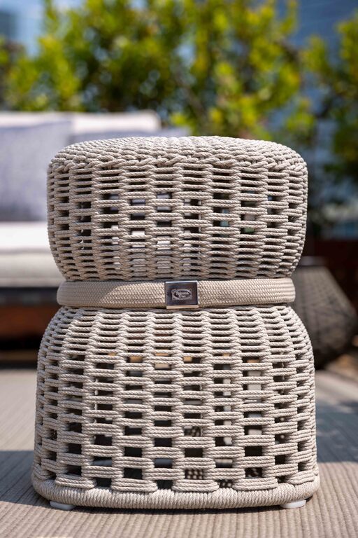It maintains the organic shapes that recall women's fashion: a sinuous silhouette, tightened by a thin rope braid to emphasise the waist. In the outdoor version of the Leplì series, Oshiro adds the woven motif that characterises the Sparkler collection of outdoor lamps: polypropylene strings that wrap around the aluminium rod structure and create a unique effect of transparency and lightness. Rising upwards, the hand-made weaving becomes increasingly dense until it becomes solid on the seating surface, which hides the elastic belt springs within. The pouf/stool is available in 3 colour combinations that match the colour of the rope and the structure.