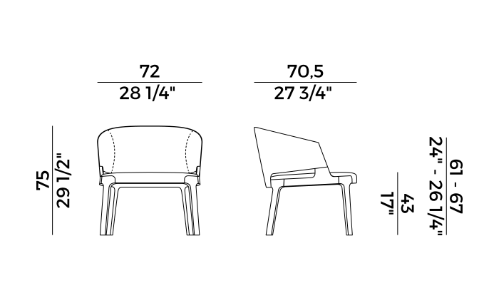 Swivel tub chair with seat and backrest padded in fire retardant polyurethane foam. Seat details in solid ash wood or Canaletto walnut and four-star swivel base in embossed black painted metal. Finishes and coverings as per collection.
