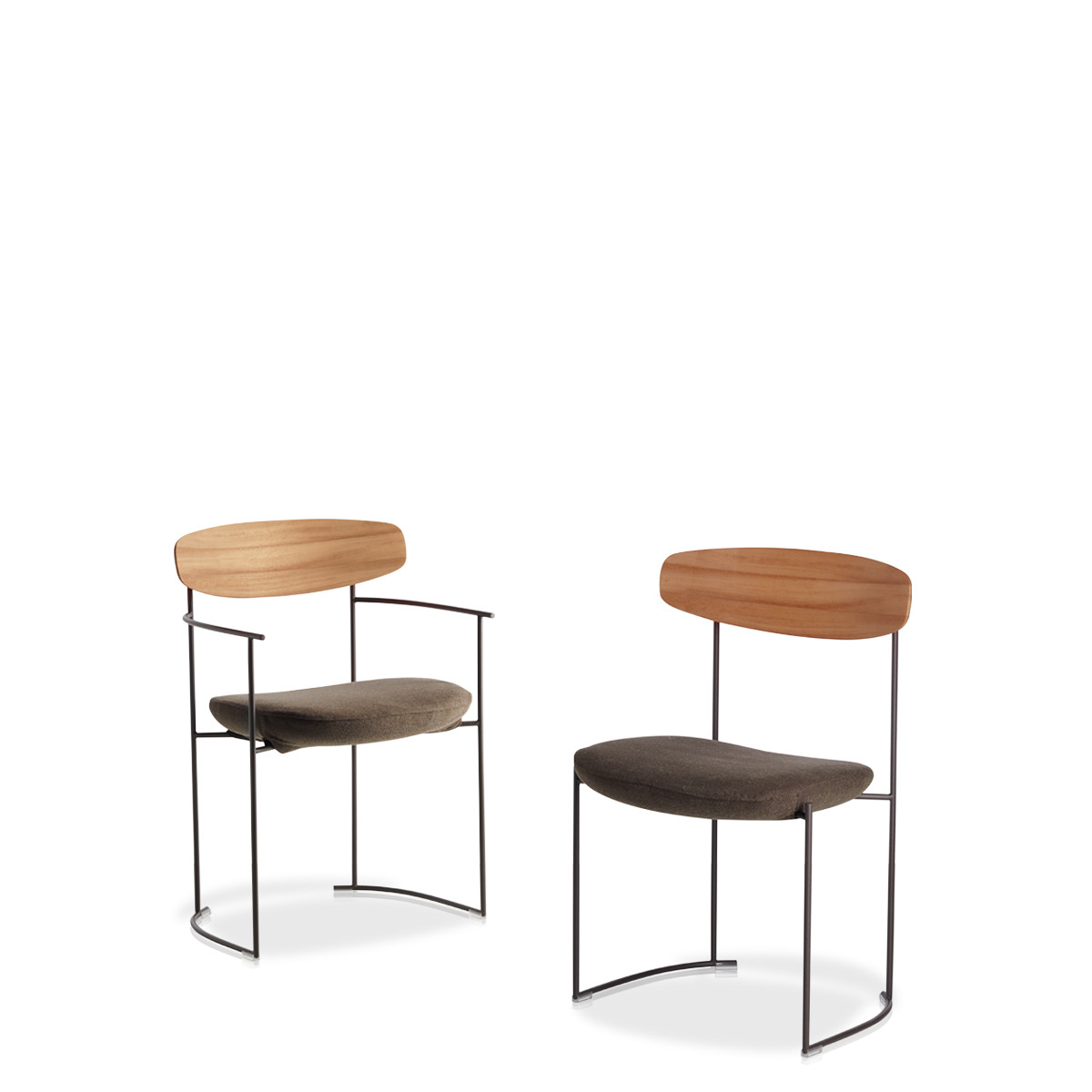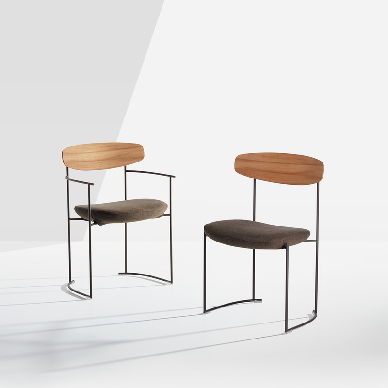 Keel chair and small armchair were born from the research between geometric rigor and organic sinuosity.