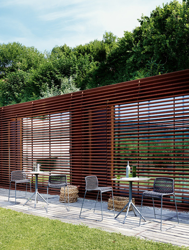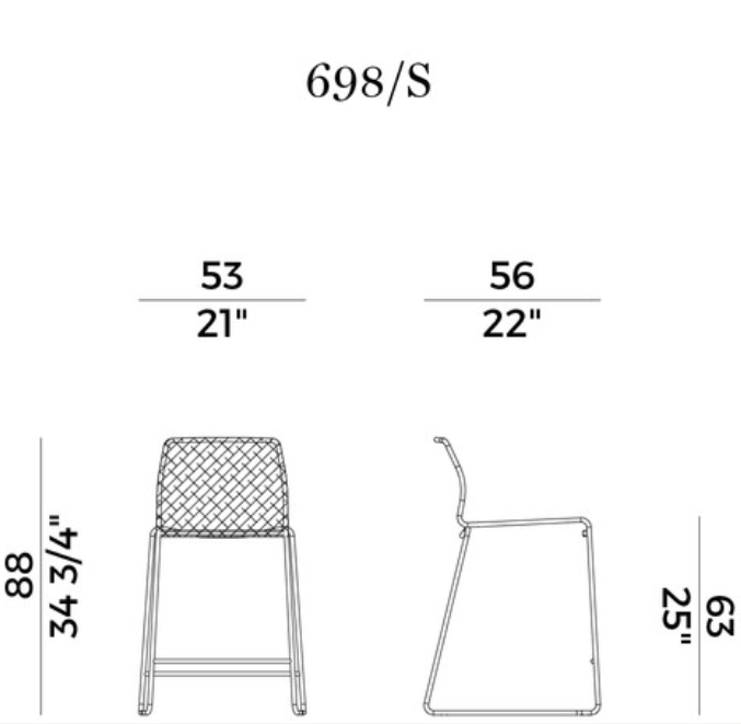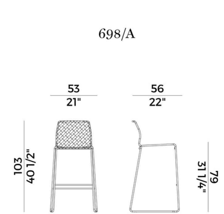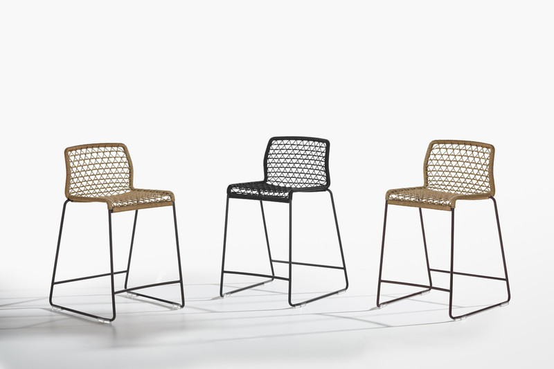 Characterized by a slender frame in painted metal tube with sled-shaped legs, and weaving in nautical or PVC rope, the Vela stools are proposed in two different heights, making them suitable for multiple contexts.