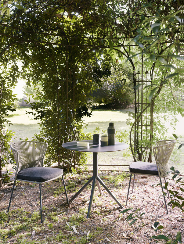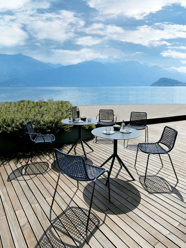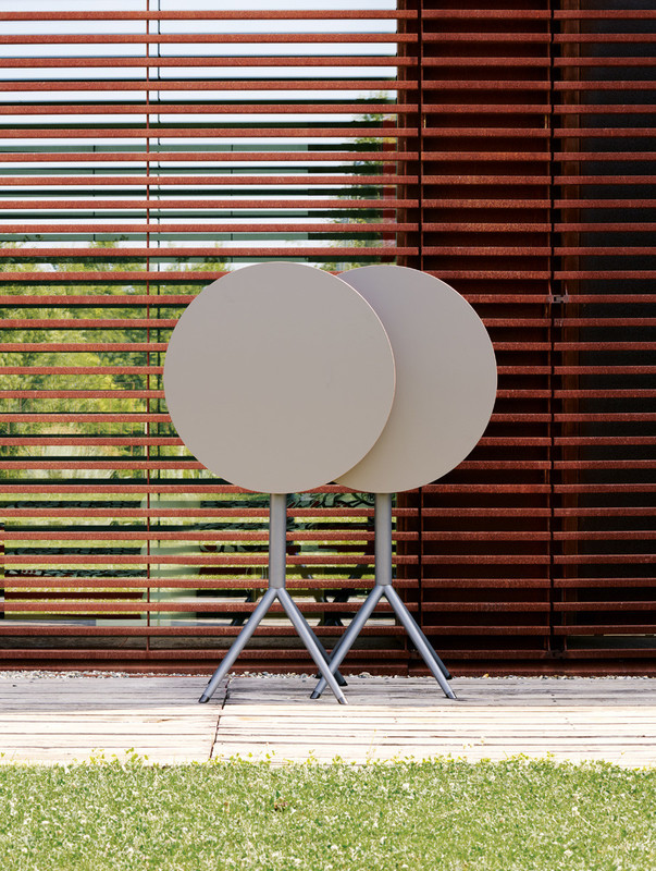 Katana is a table designed to adapt to both domestic interiors and open-air contexts, proposed in a version with four legs in embossed painted metal and rectangular top in laminated porcelain or HPL, in the finishes as per collection.