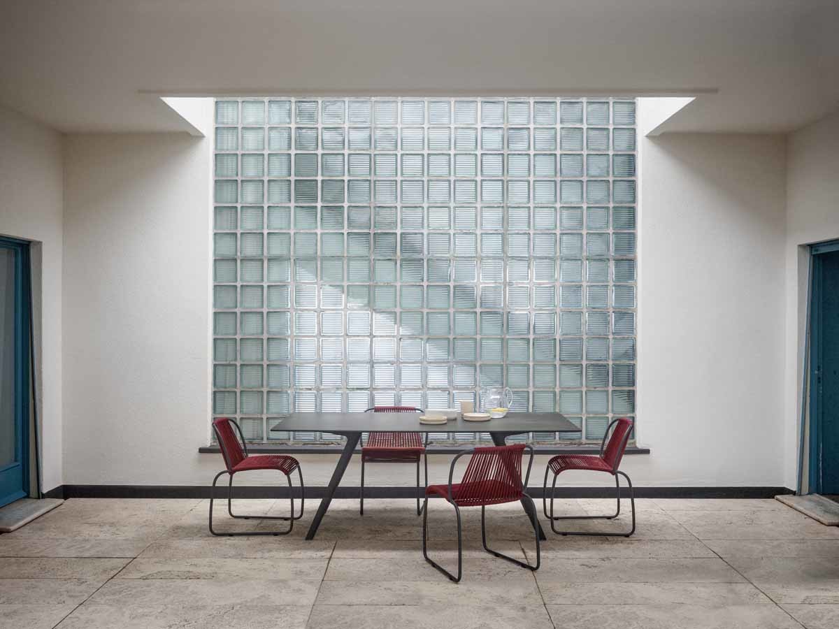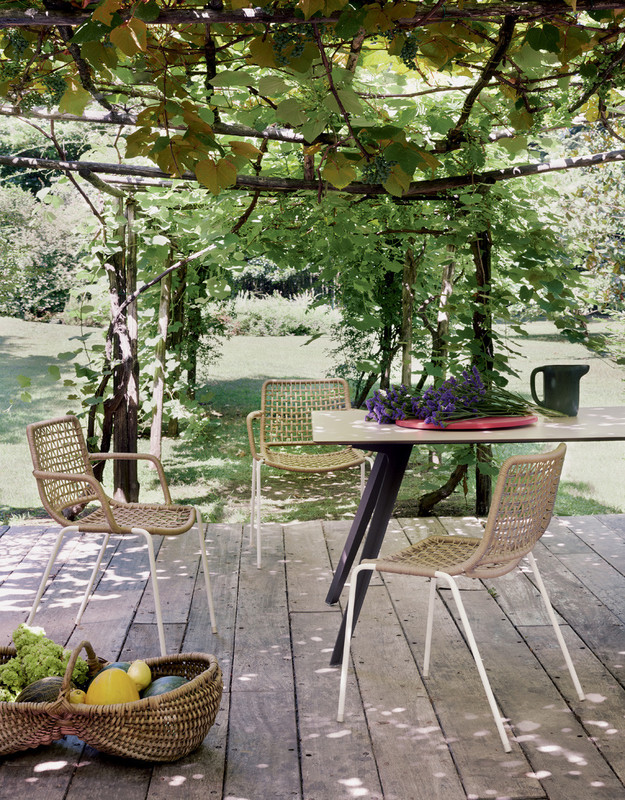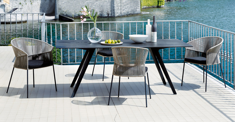 Katana is a table designed to adapt to both domestic interiors and open-air contexts, proposed in a version with three legs in embossed painted metal and a ?120 e ?130 cm round top in laminated porcelain or HPL, in the finishes as per collection.
