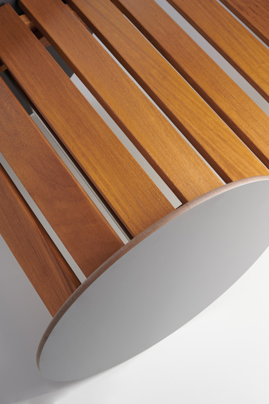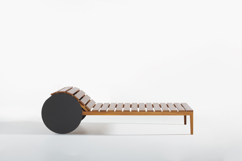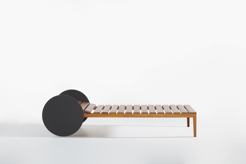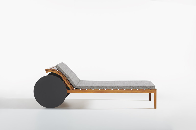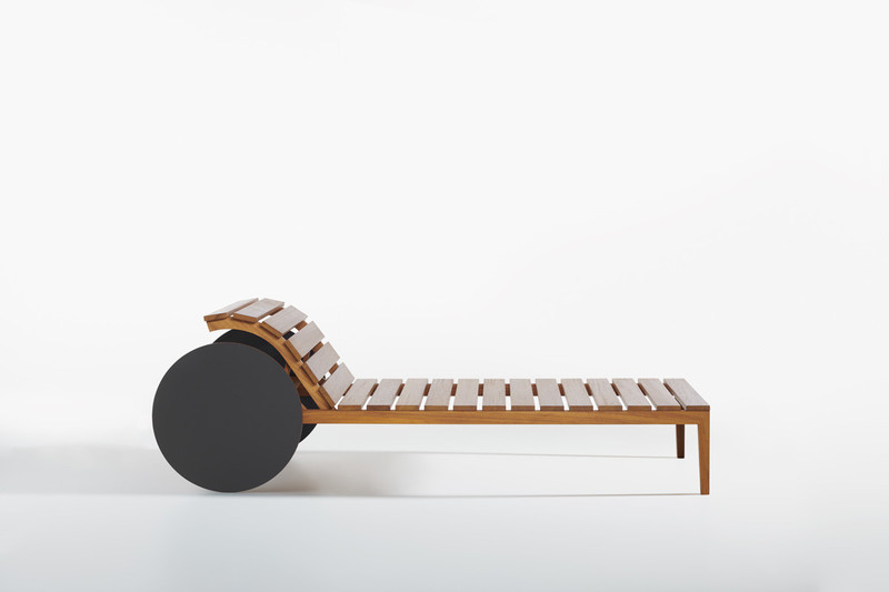 Suno reinterprets the universal shape of the sunbed, distinguishing itself by the large HPL wheels with a 57 cm diameter.