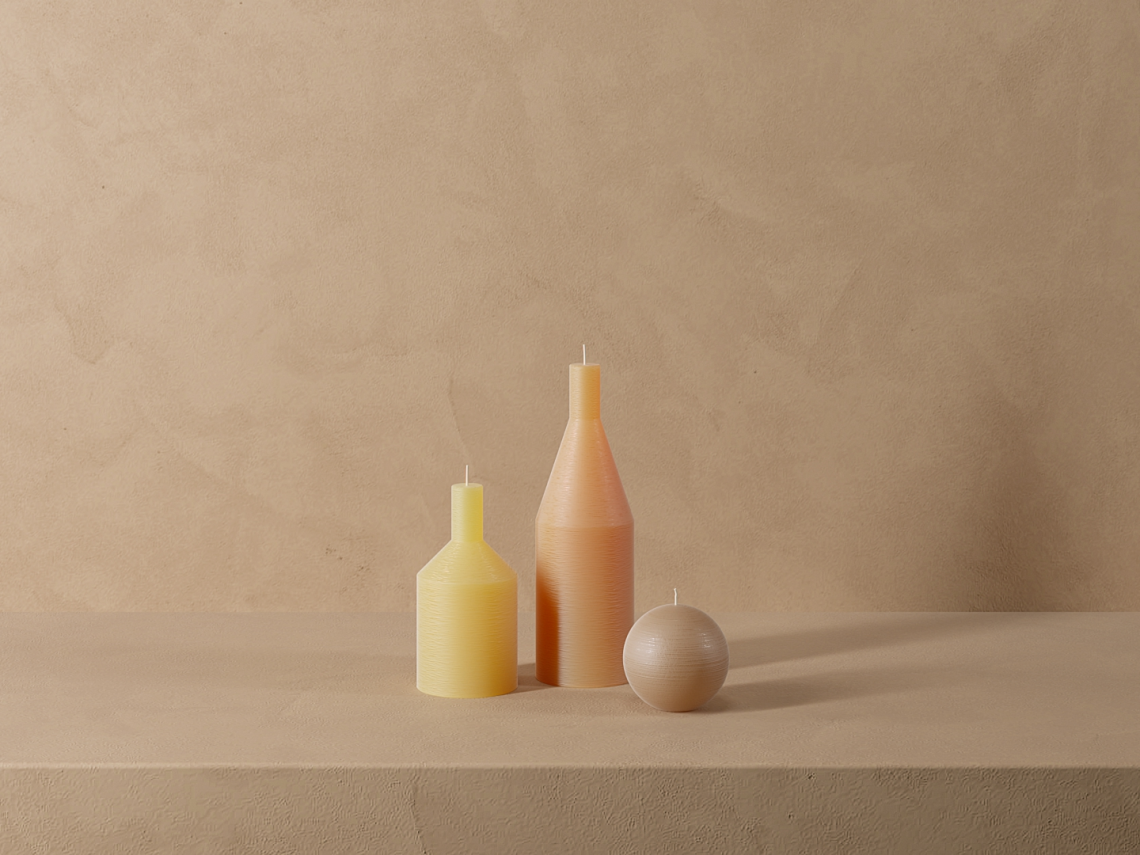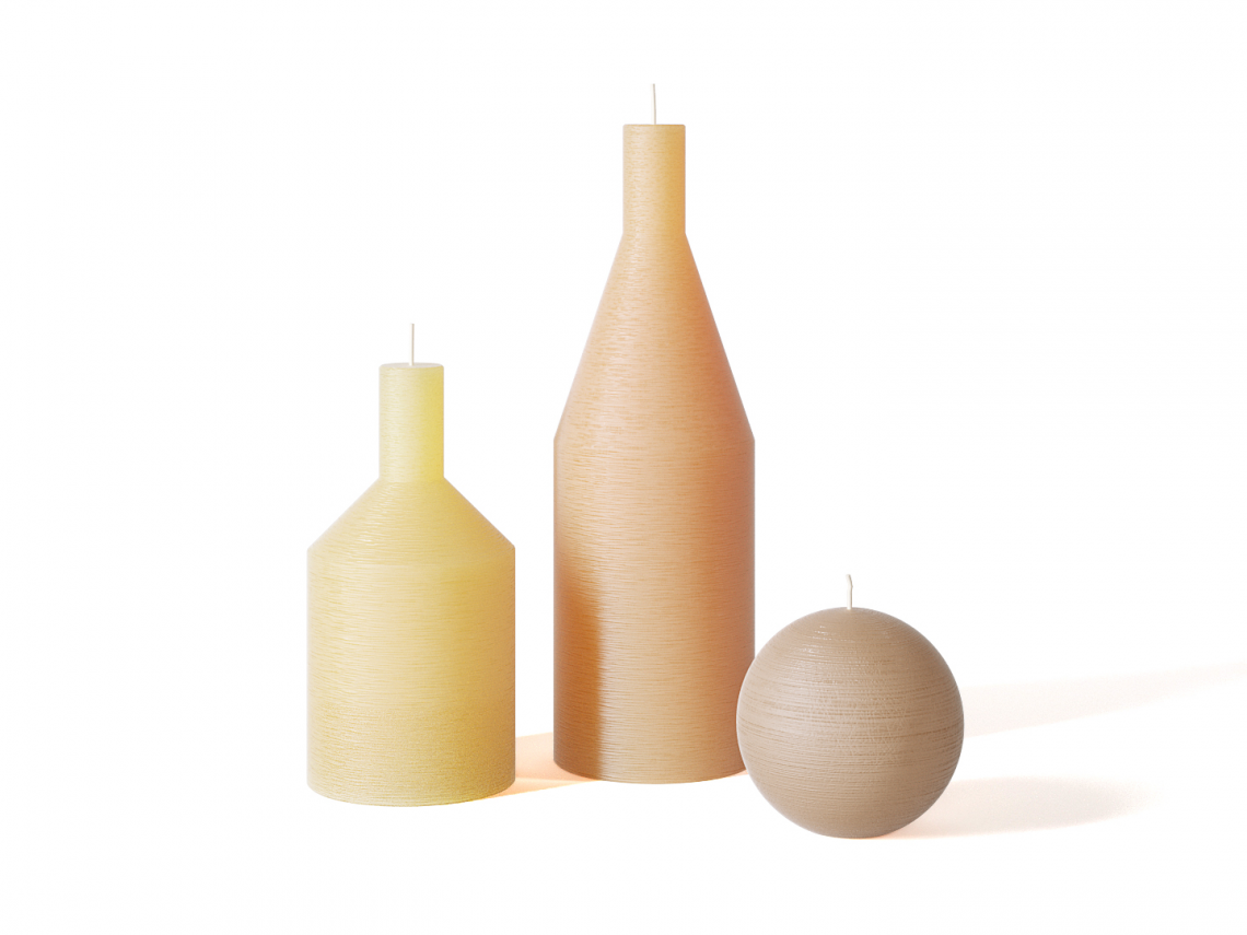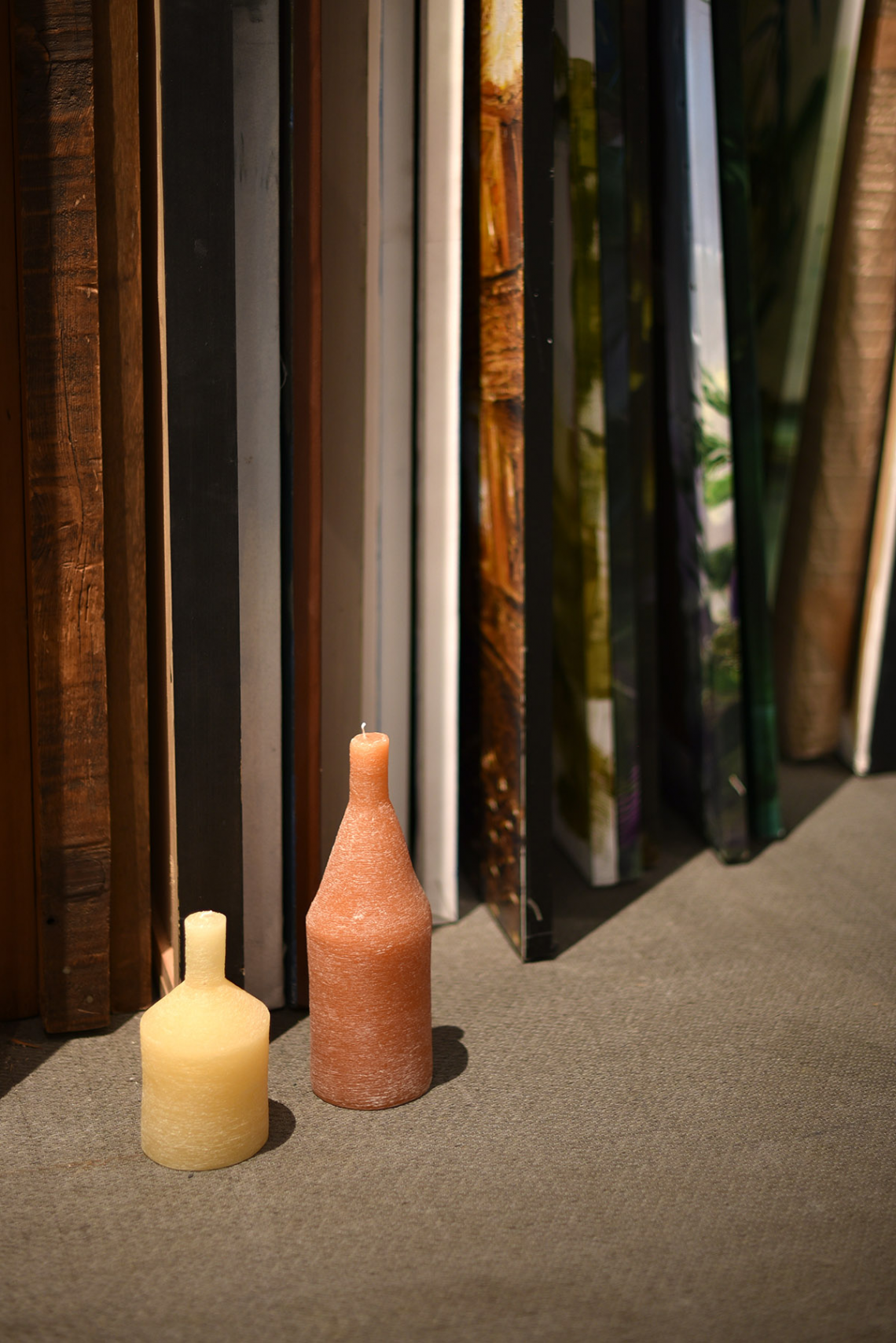 Candele in cera realizzate artigianalmente secondo le forme delle tipiche bottiglie Morandiane.