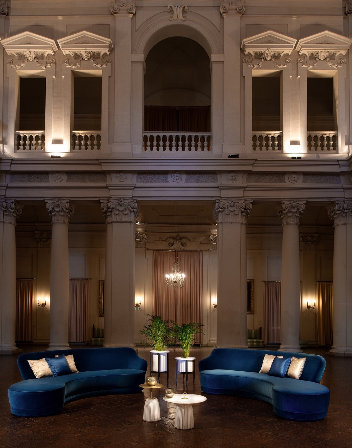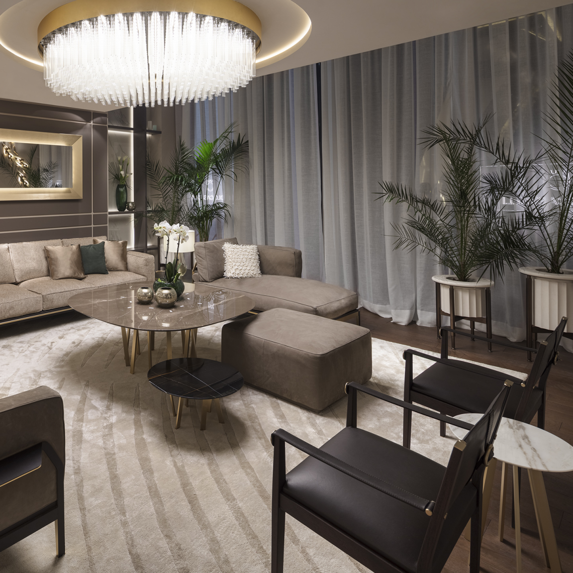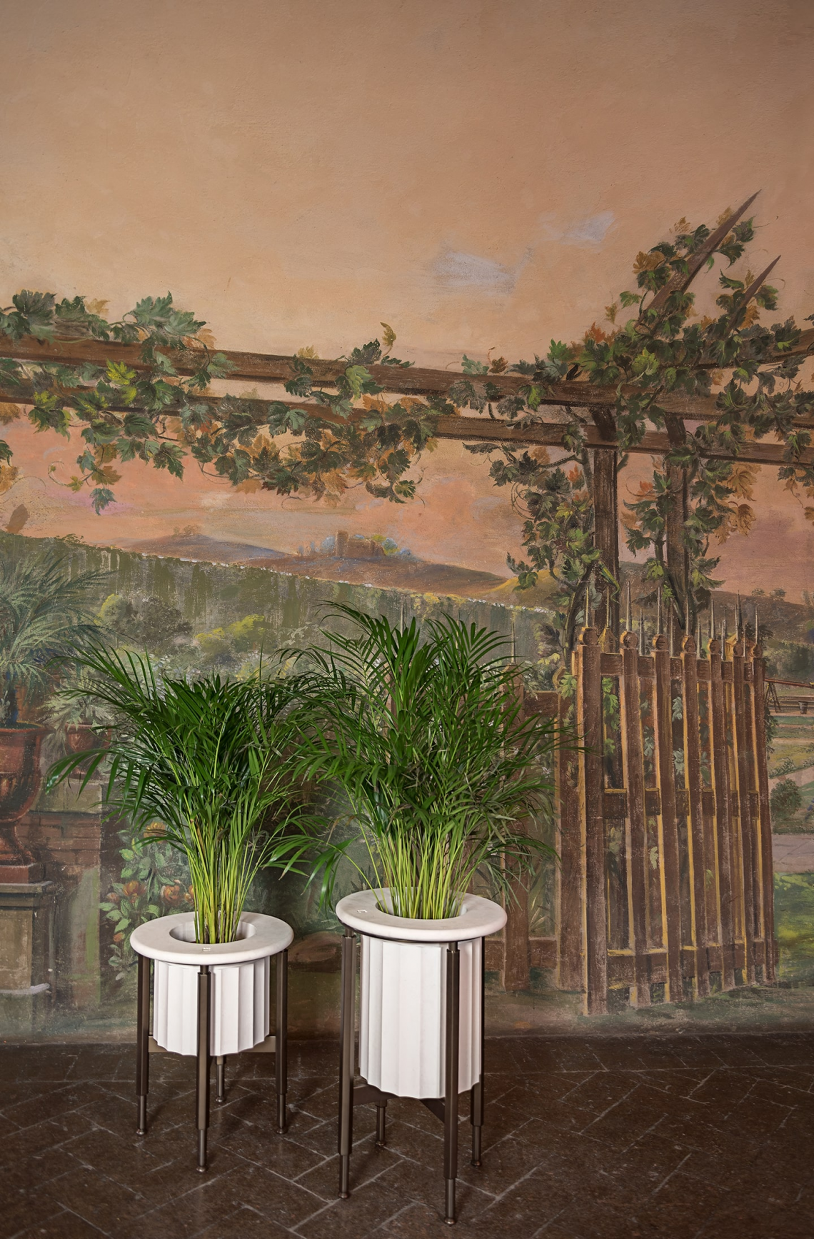 La potenza della pietra naturale limestone (colori bianco per i modelli A e B, o grigio tortora per il modello C) esalta il verde del fogliame, in questa serie di vasi dalla struttura metallica impreziosita dalla finitura bronzo shadow opaco.