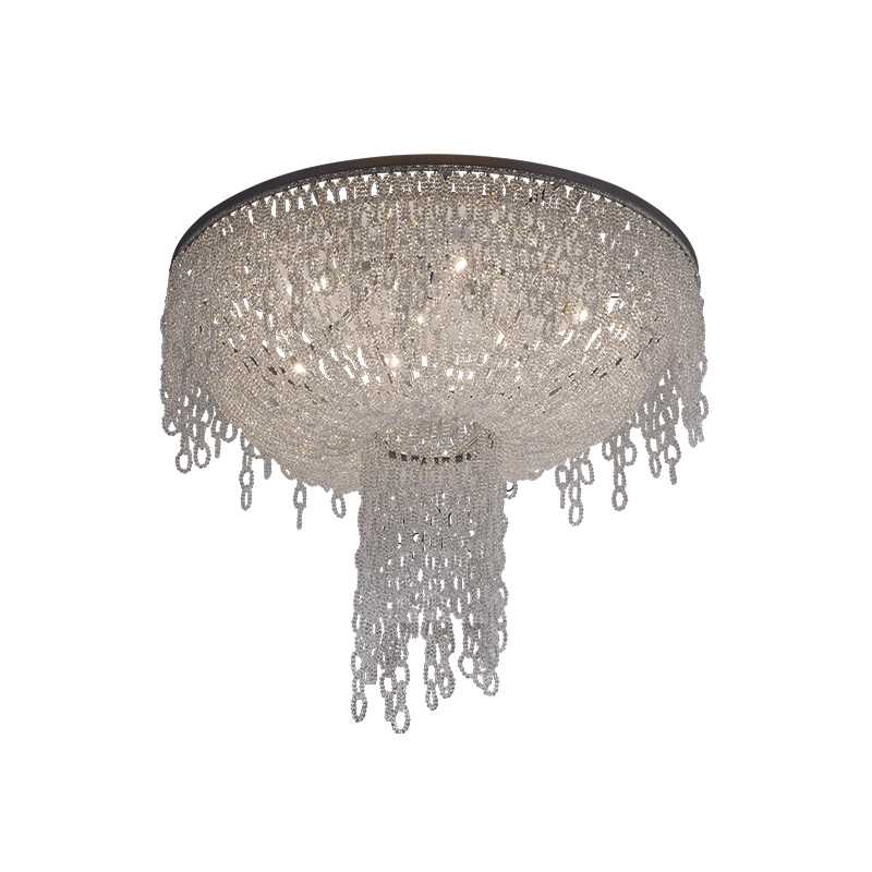 A smooth cascade of crystal chains wraps Eva and its metallic structure, over which expert artisan hands weave textures, patiently sticking every ring, pearl by pearl: It’s the attention to details that makes the difference.