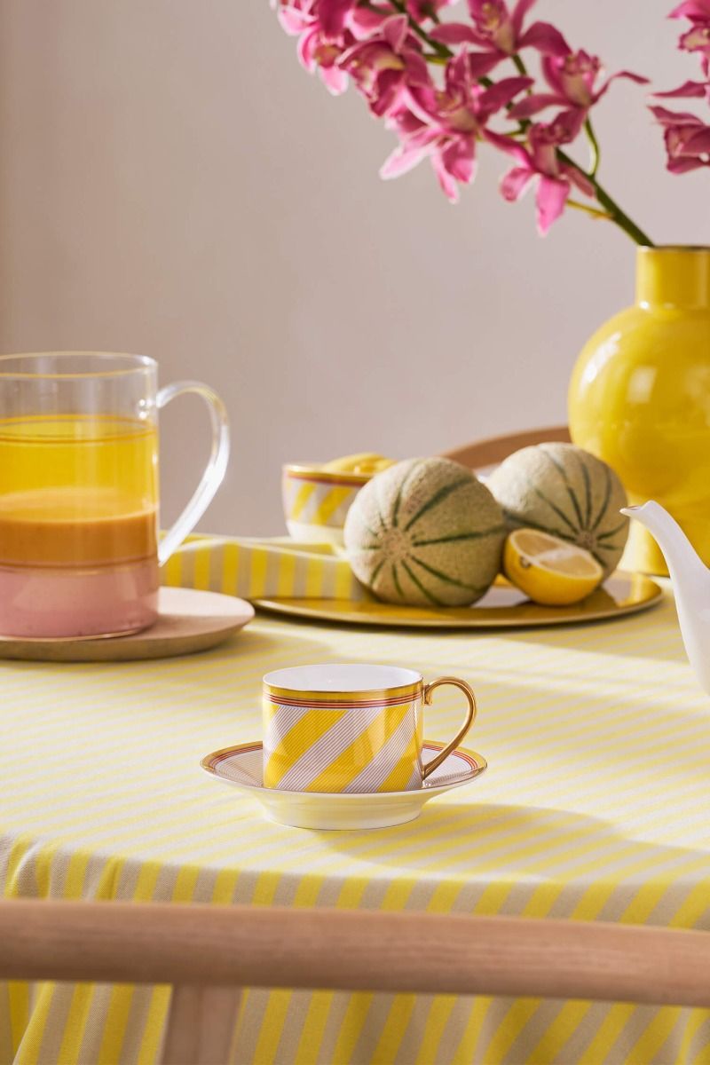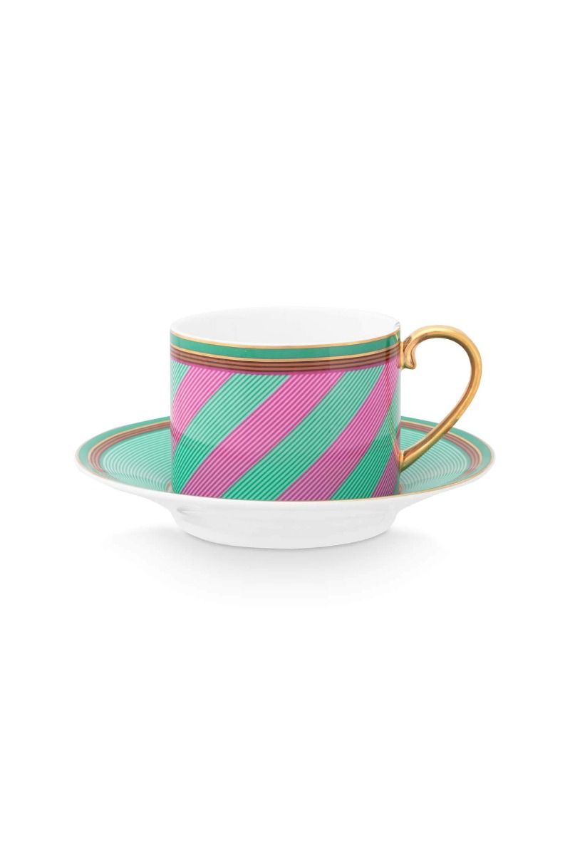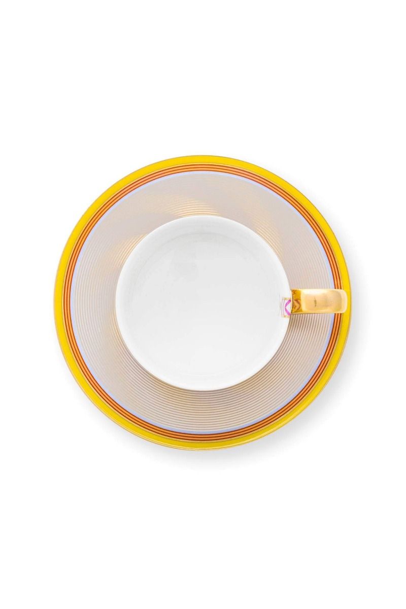 This cappuccino cup & saucer has a yellow and khaki striped design with a gold handle. This cappuccino cup is perfect to mix with the other cups of this collection or our Pip Chique collection. The Porcelain is made of bone China, a high-quality thin porcelain with a sophisticated design. Have a look at the full Pip Chique Stripes collection for more inspiration.