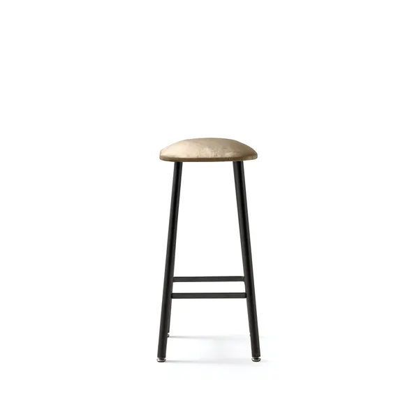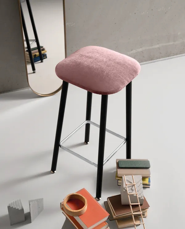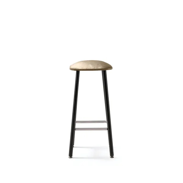 Sgabello a forma conica con struttura a 4 gambe e poggiapiedi cromato.