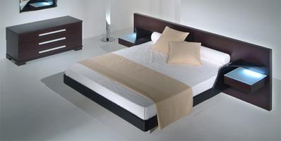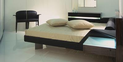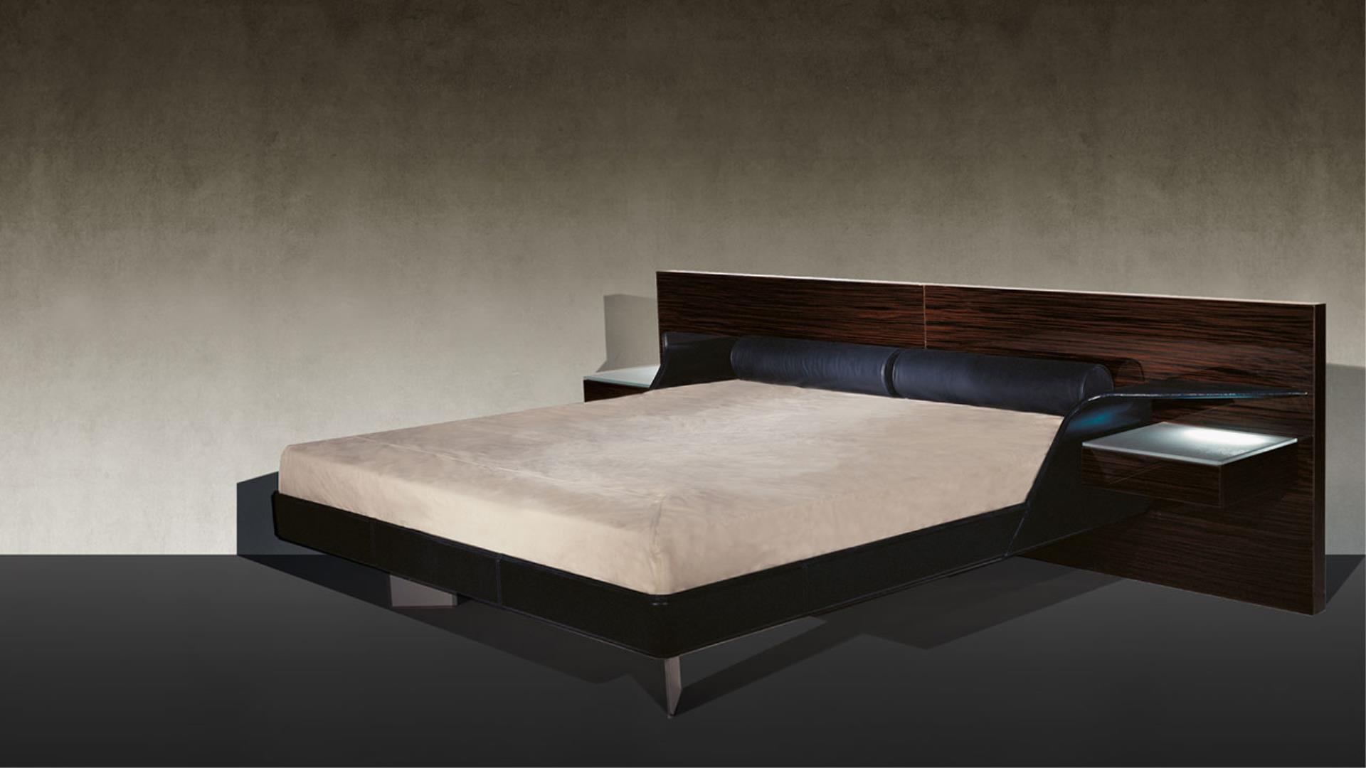 Bed with wooden headboard in matt or shiny lacquered finish or in shiny Ebony wood.