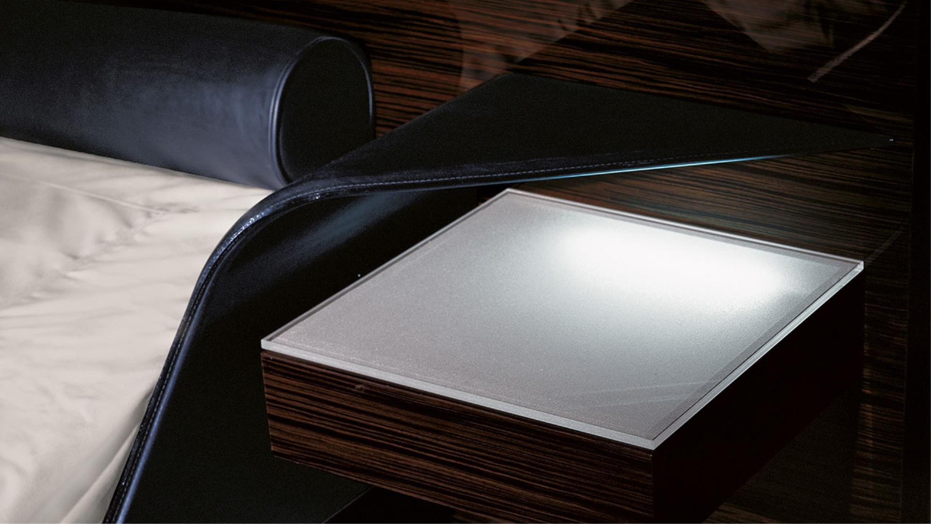 Optional suspended side tables with 1 drawer and top in extraclear bush-hammered glass with internal lighting.