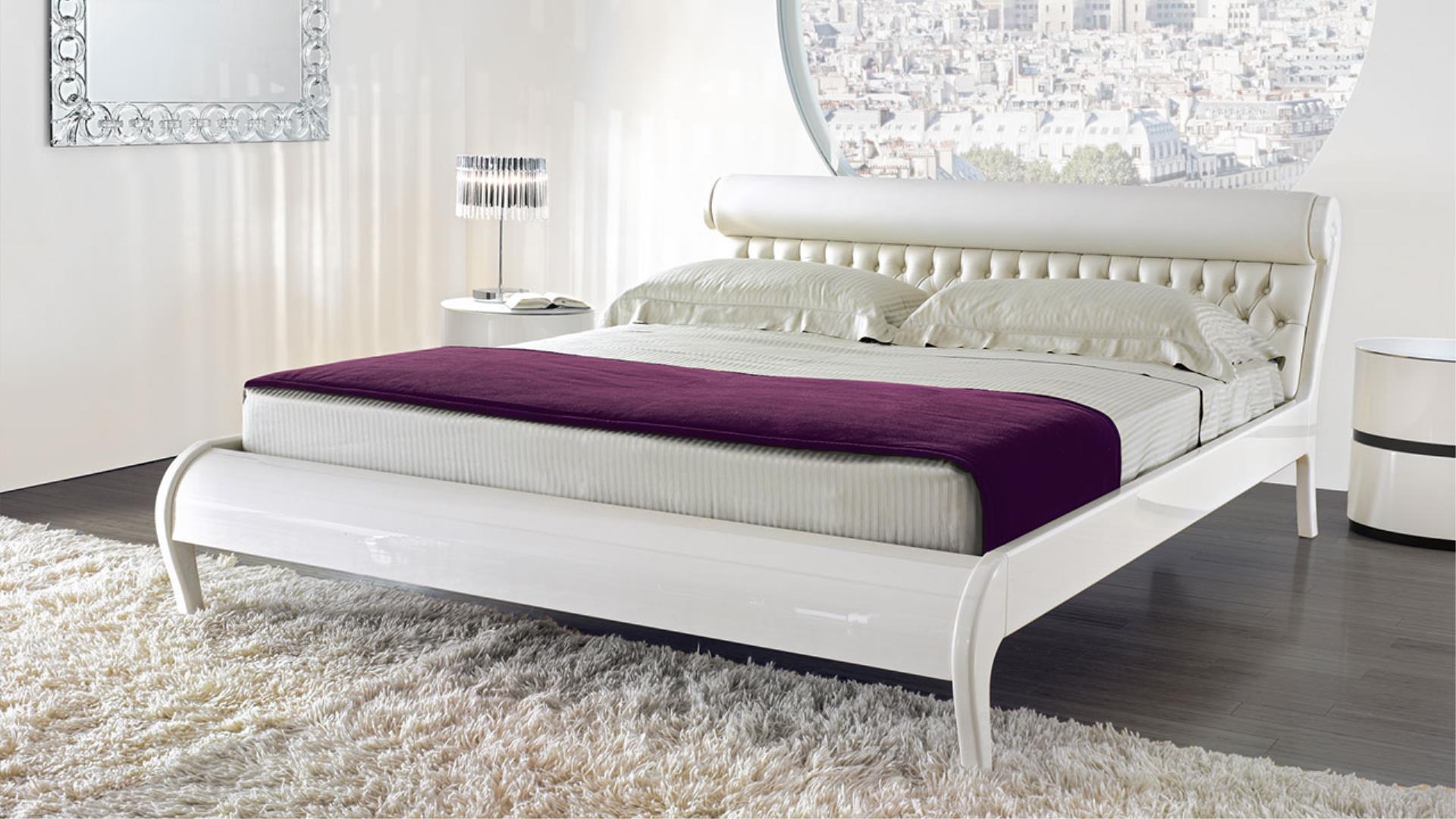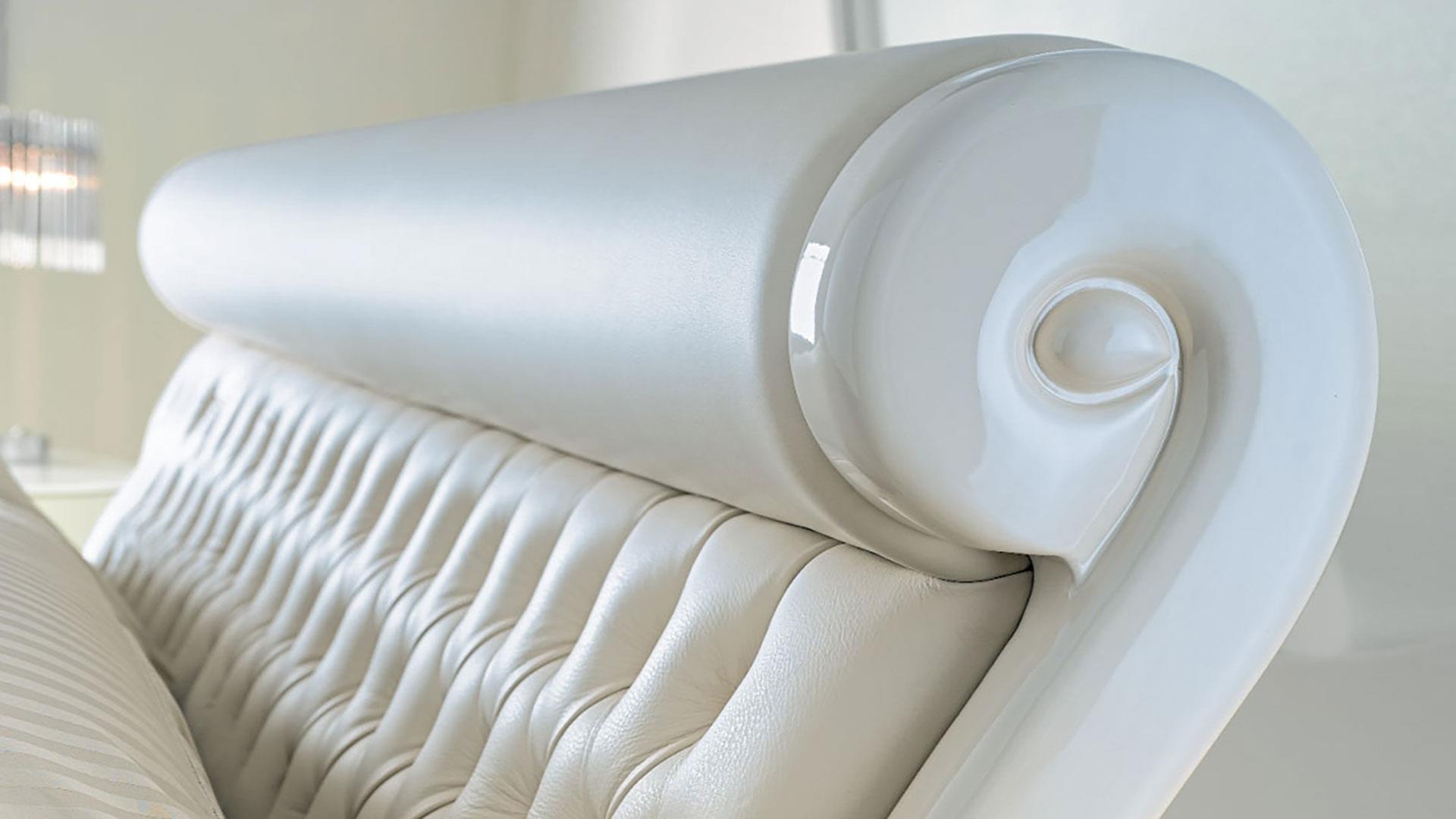 Padded headboard upholstered in velvet or in leather.