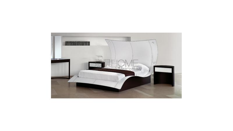 Shaped bed with curved high headboard covered in leather with base in matt laquered finish.