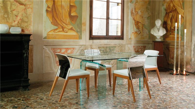 Legs: round section in brushed steel;  oval section in brushed aluminium, shiny chrome, shiny black-nickel, shiny lacquered or in satin brass or titanium finish, in curved 24 mm thick glass or 19mm thick extra-clear glass.