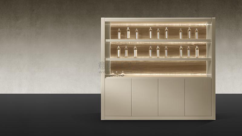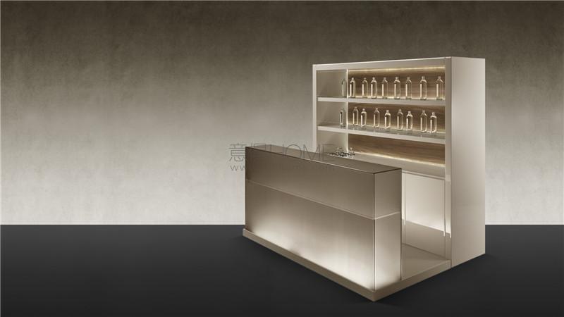 Bar unit composed by: wall unit as special version of Avantgarde libreria in shiny lacquered wood with applications of bevelled lacquered glass on the fronts and back in white lacquered glass, smoked mirror, Canaletto walnut  or in Marble glass, with 2 long shelf and 4 doors; Bar counter with light in extraclear, bronze or smoke with frosted and bush-hammered finish or in glass with Vienna pattern design; platform in shiny finish matching the bookcase. Optional cooled nottle holder and Led lighting on the shelves.