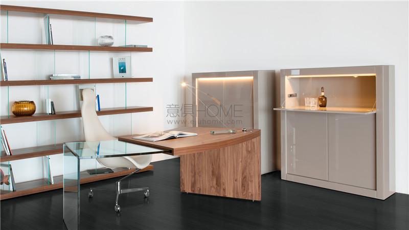 E - Element with transparent glass shelves and back in lacquered glass.