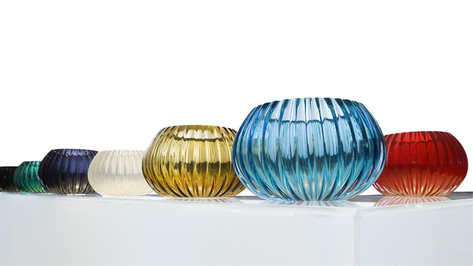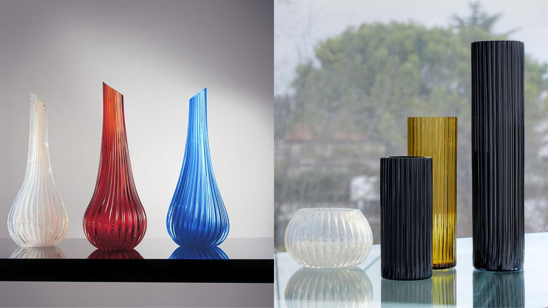 Collection of vases and bowls in ribbed Murano glass, in the colours: transparent, black, red, turquoise, amethyst, amber or white with gold.