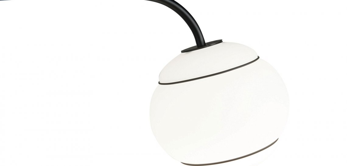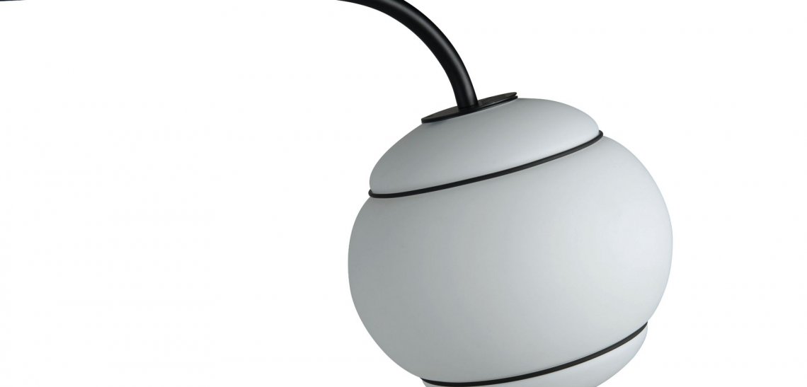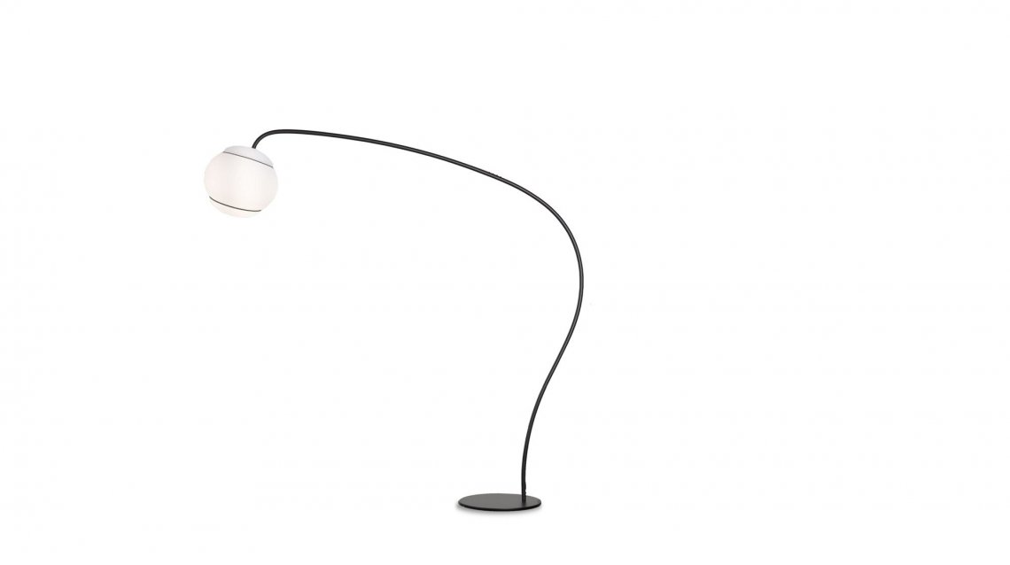 Lampada da terra con struttura in acciaio laccato nero opaco. Paralume in vetro soffiato con doppio cerchiaggio nero.