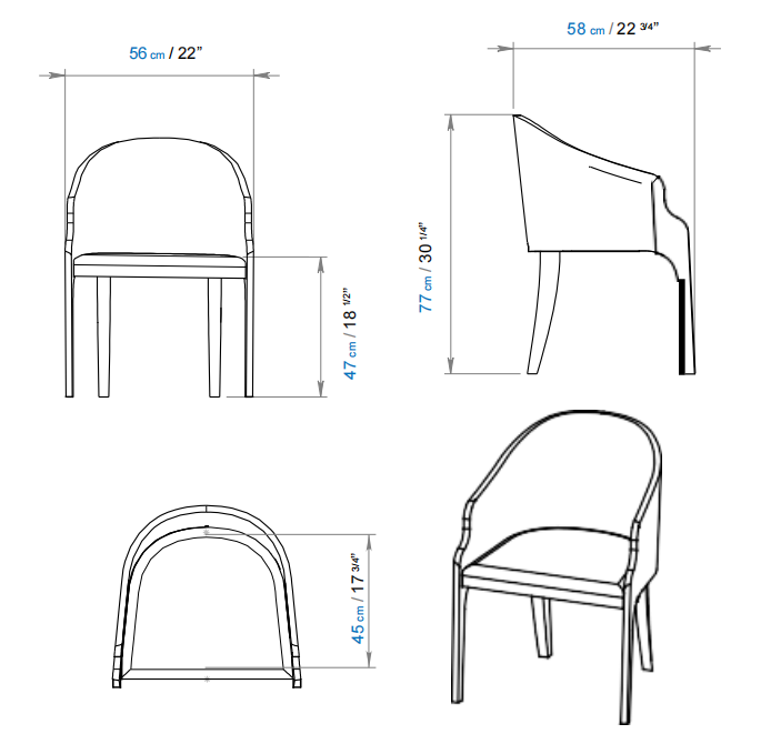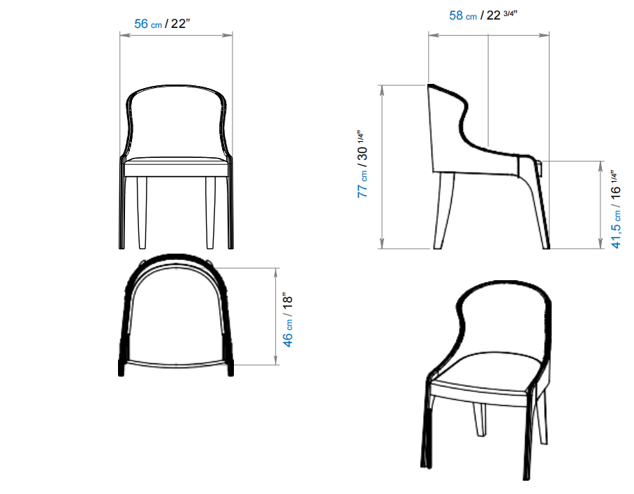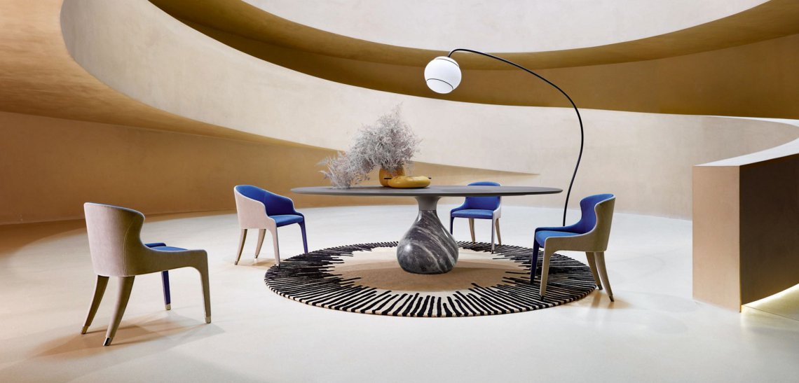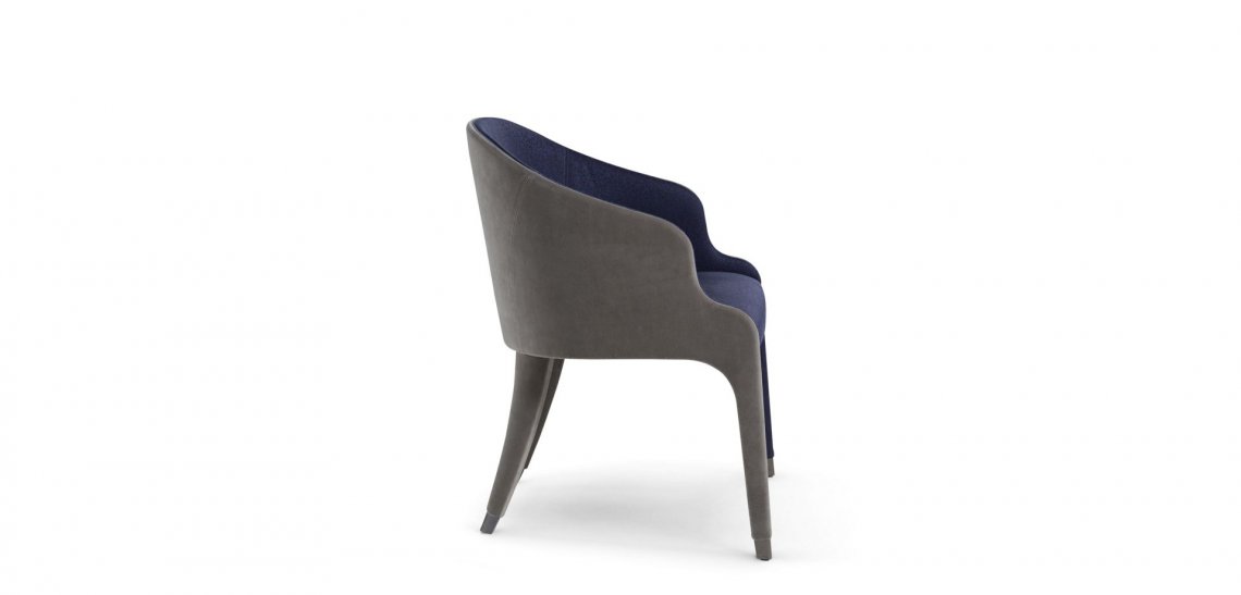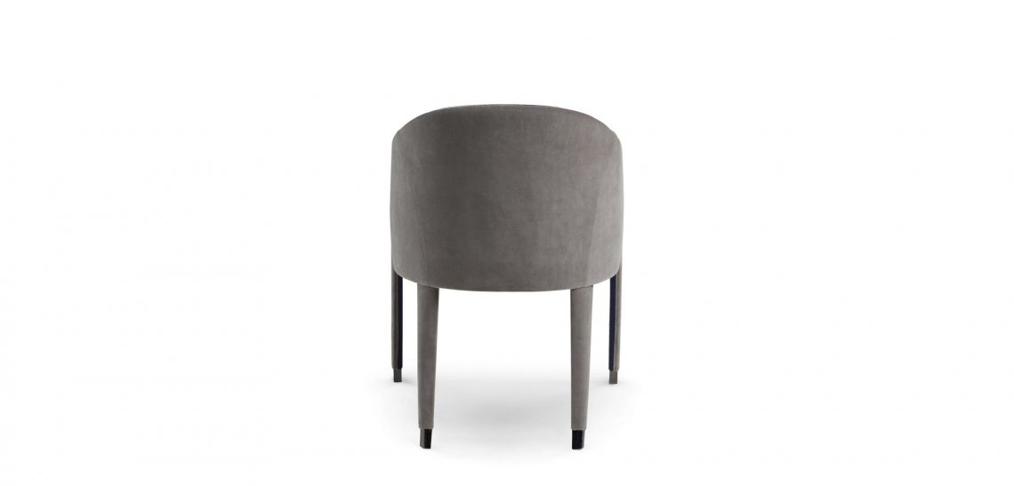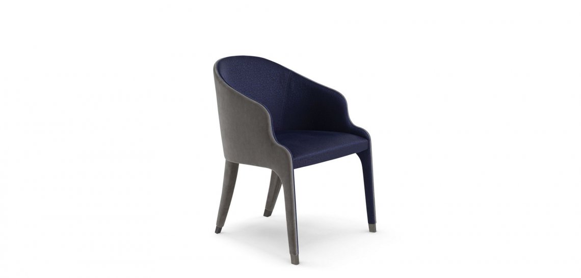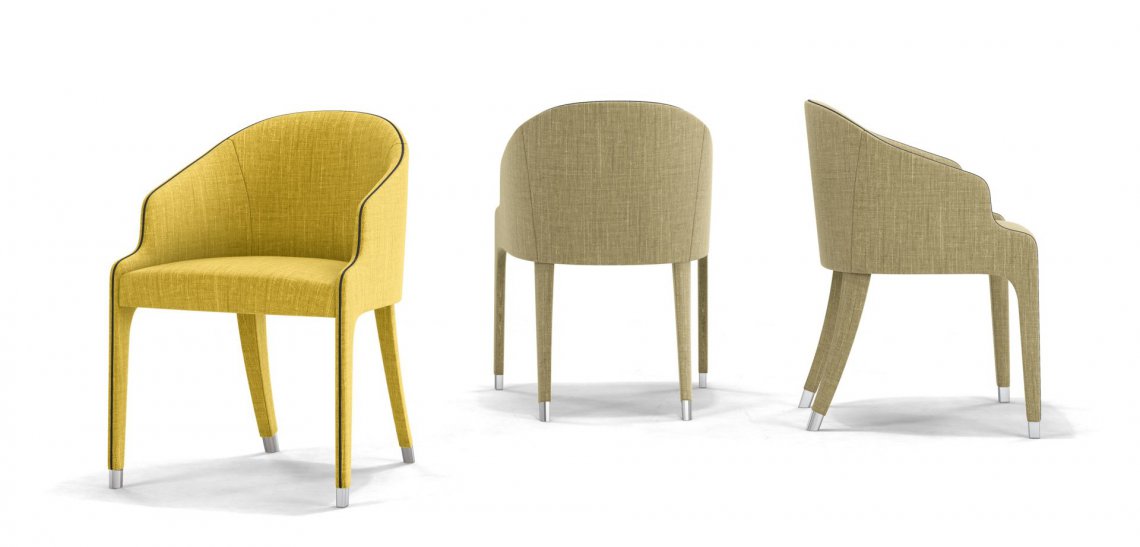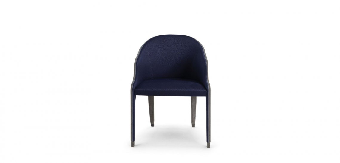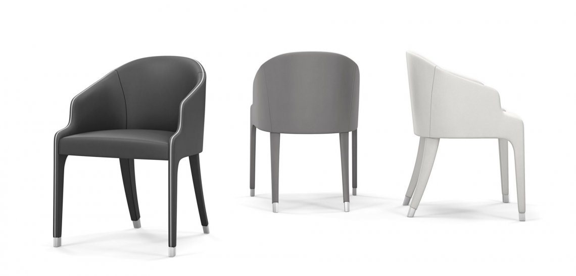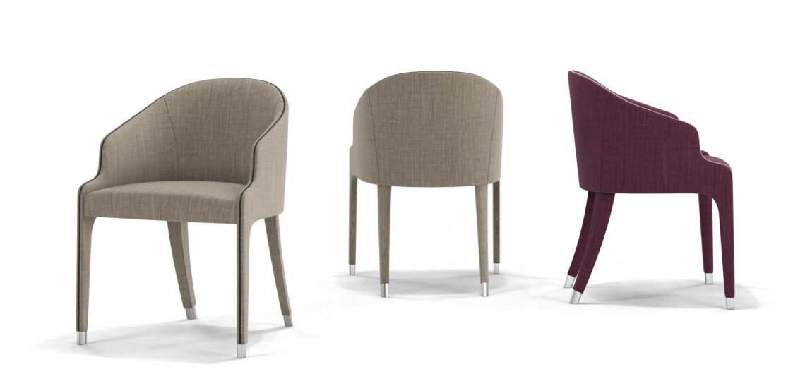 Si deve al designer Enrico Franzolini questa collezione di sedie dalle linee delicate, rivestite interamente di tessuto o di pelle. La loro personalità è data dal movenza continua dello schienale verso i braccioli, che conferisce un carattere molto intimo. Le gambe si prolungano nella stessa movenza e terminano con piedini cromati.