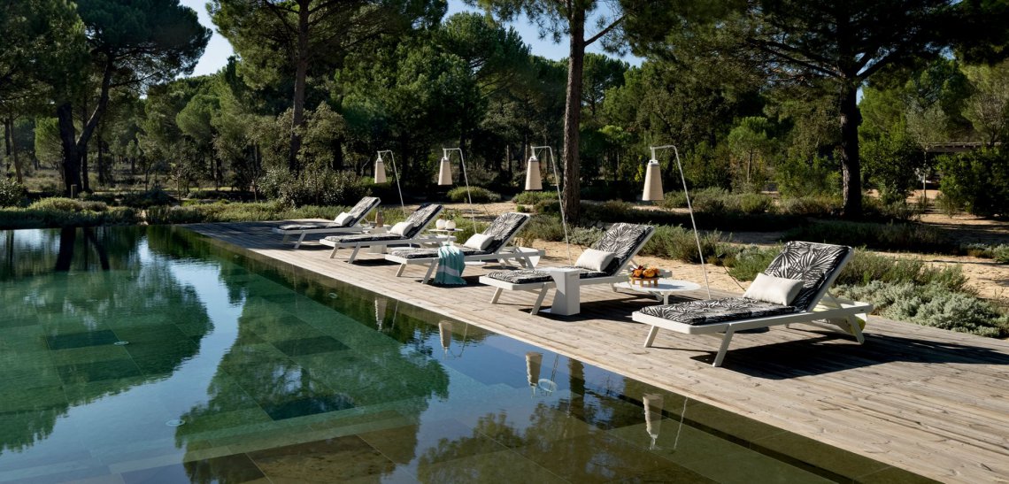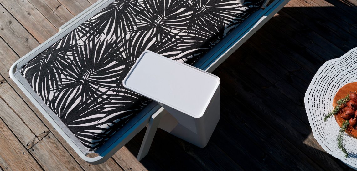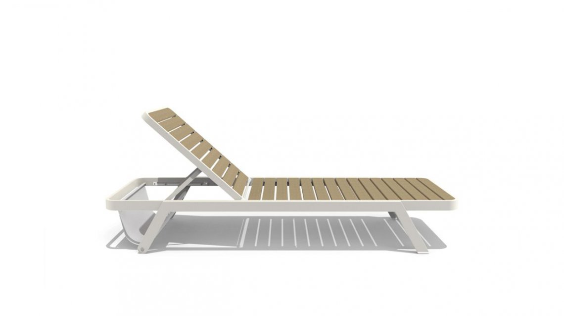 Leggera e mobile, impilabile, in alluminio riciclabile, Sunset è la chaise longue perfetta per godersi l'esterno. E' disponibile sia in Batyline, sia con doghe aspetto legno a base di lolla del riso.