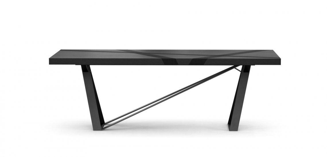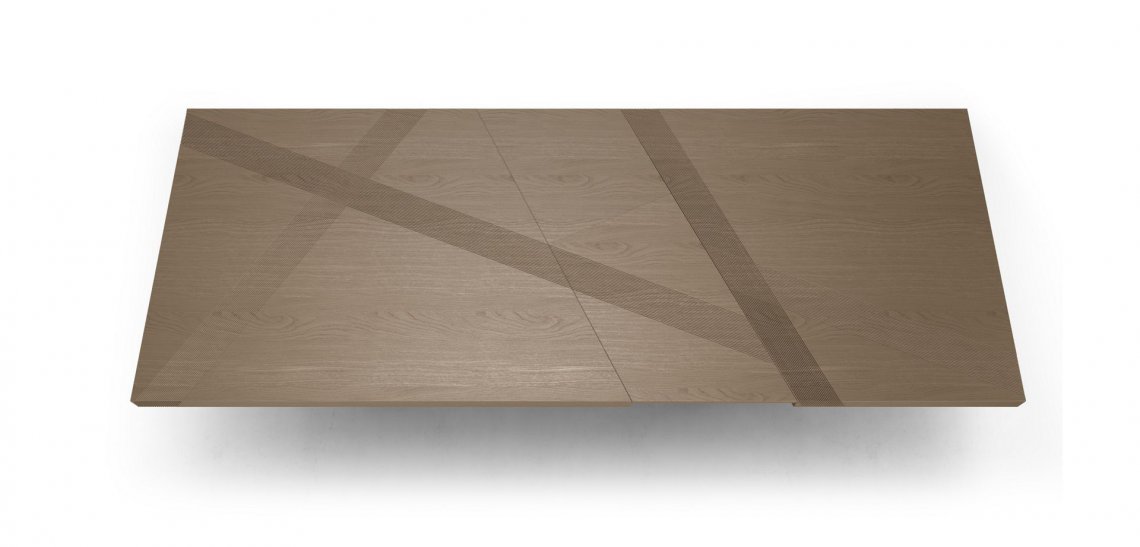 Ispirato dal lavoro di un artigiano, il designer Luigi Gorgoni ha immaginato questa collezione rivestita con un'impiallacciatura ad alto spessore con una serie di righe incise diagonalmente: un lavoro di tessitura al cuore del materiale.