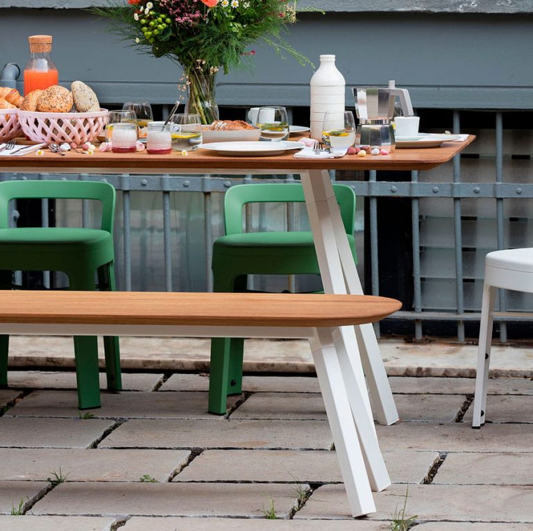 All the sizes are suitable for both outdoor and indoor use, with seats that come in hardwearing iroko wood – recommended for tables with HLP and walnut wood tops – or in warm oak wood for interiors.