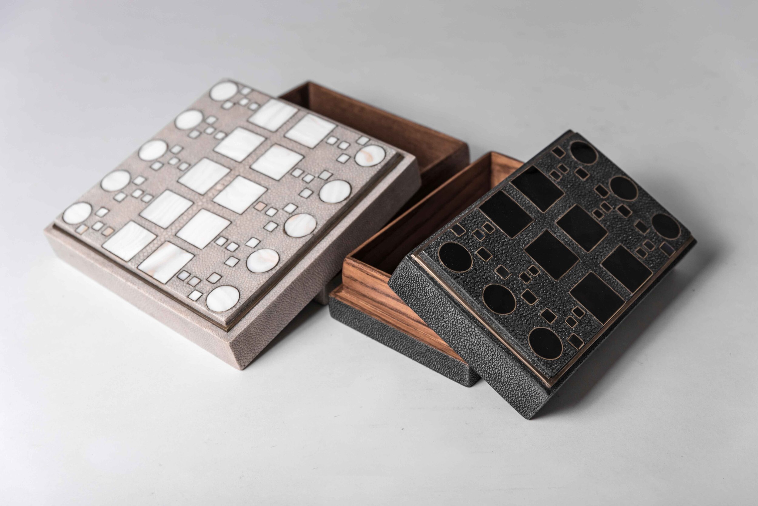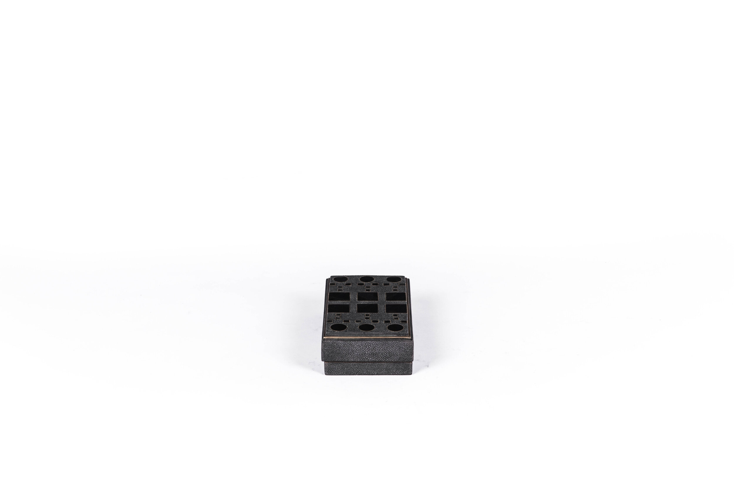 This classic box is a luxurious update to the everyday staple accent. The Klimt pattern gives the box another beautiful element to the box, demonstrating the incredible inlay work of Augousti artisans using a mixture of shagreen, shell and bronze-patina brass.