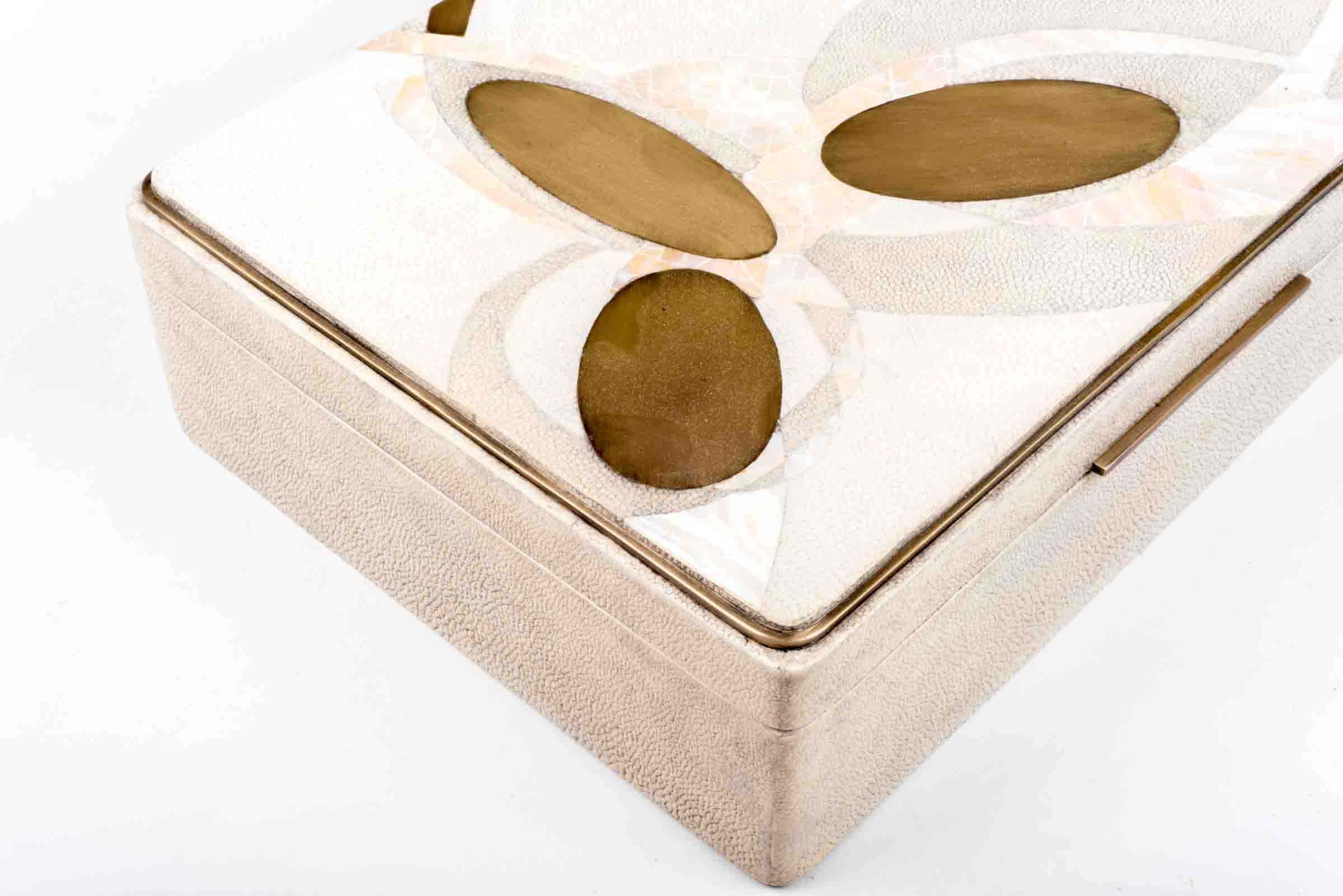 The Eclipse Light Jewelry Box, includes intricate inlay work to create this abstract cosmic-inspired pattern. This item comes with a removable velvet interior box.
