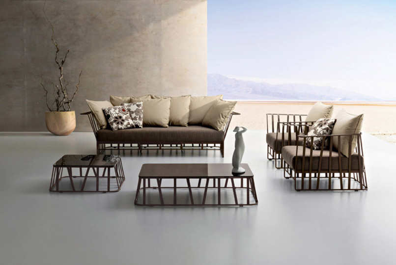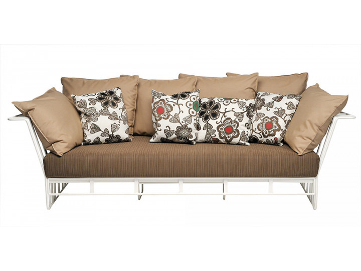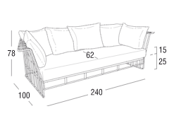 Divano in acciaio 304 verniciato a polveri, intrecciato con Flat Trendyrope. Un divano accogliente, dove la particolare geometria dello schienale si coniuga perfettamente al desiderio di comfort,  creando un angolo per vivere momenti di relax. Ottimo per arredare terrazzi e patio, dona forte personalità anche alle zone living interne. Ideale per arredamenti residenziali e contract.