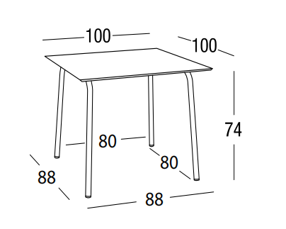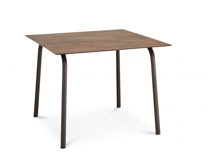 Tavolo quadrato con base in acciaio verniciato a polveri, top in HPL per esterni, finitura in corten. La finitura in corten dà un tocco di vissuto a questo tavolo dalle linee semplici e dai colori mediterranei. La qualità dei materiali lo rende ideale sia per l‘a(chǎn)rredamento esterno che interno, adatto ad un arredamento residenziale e contract.