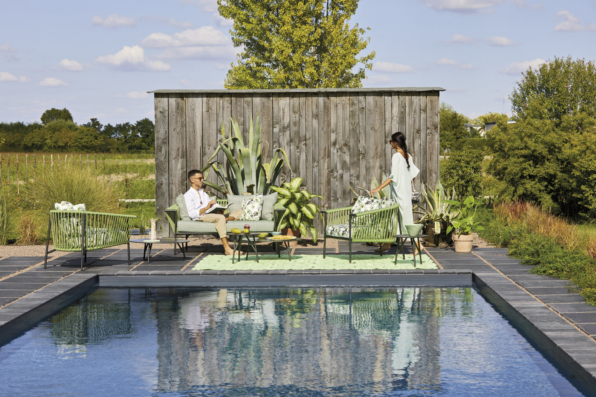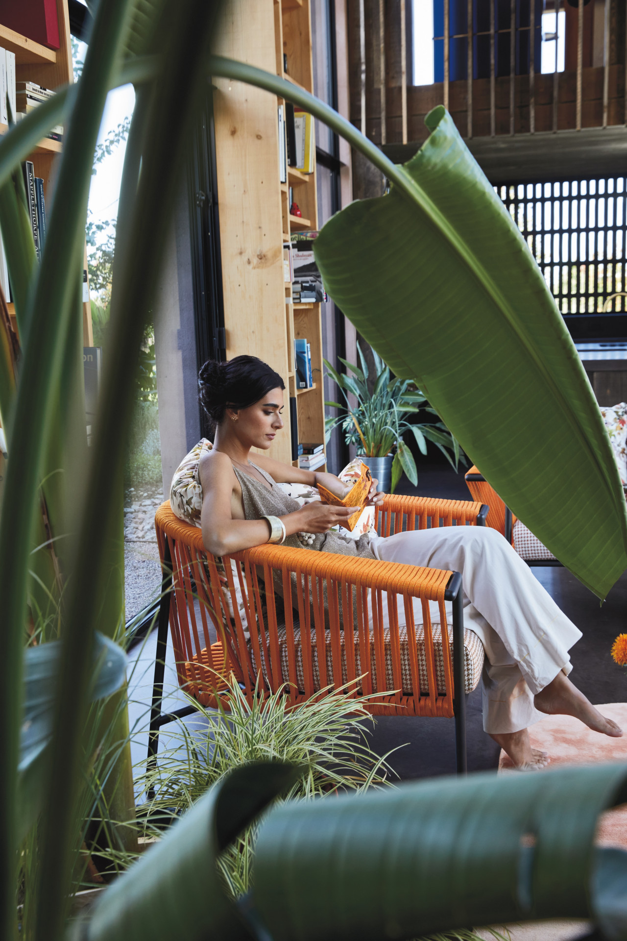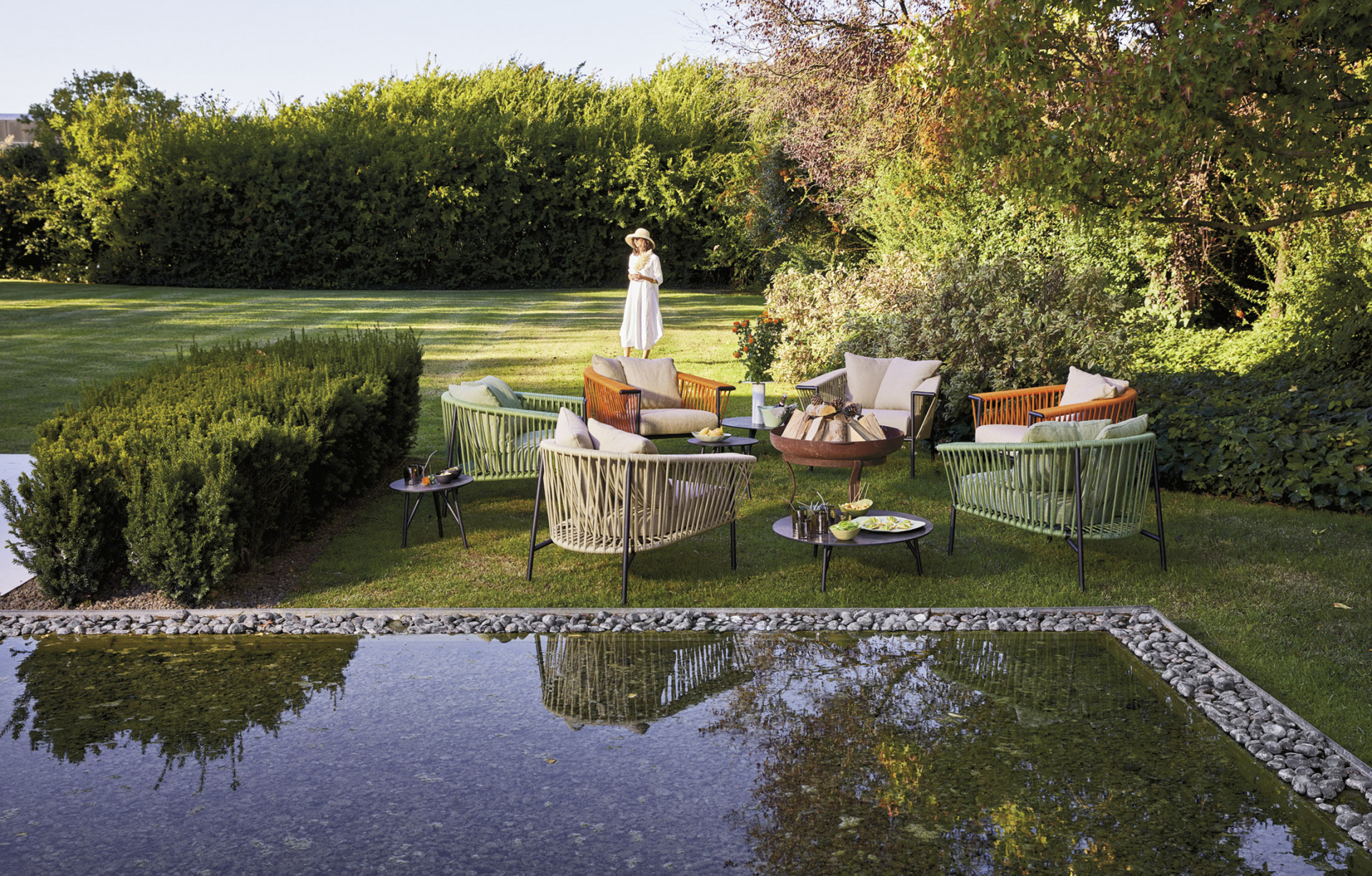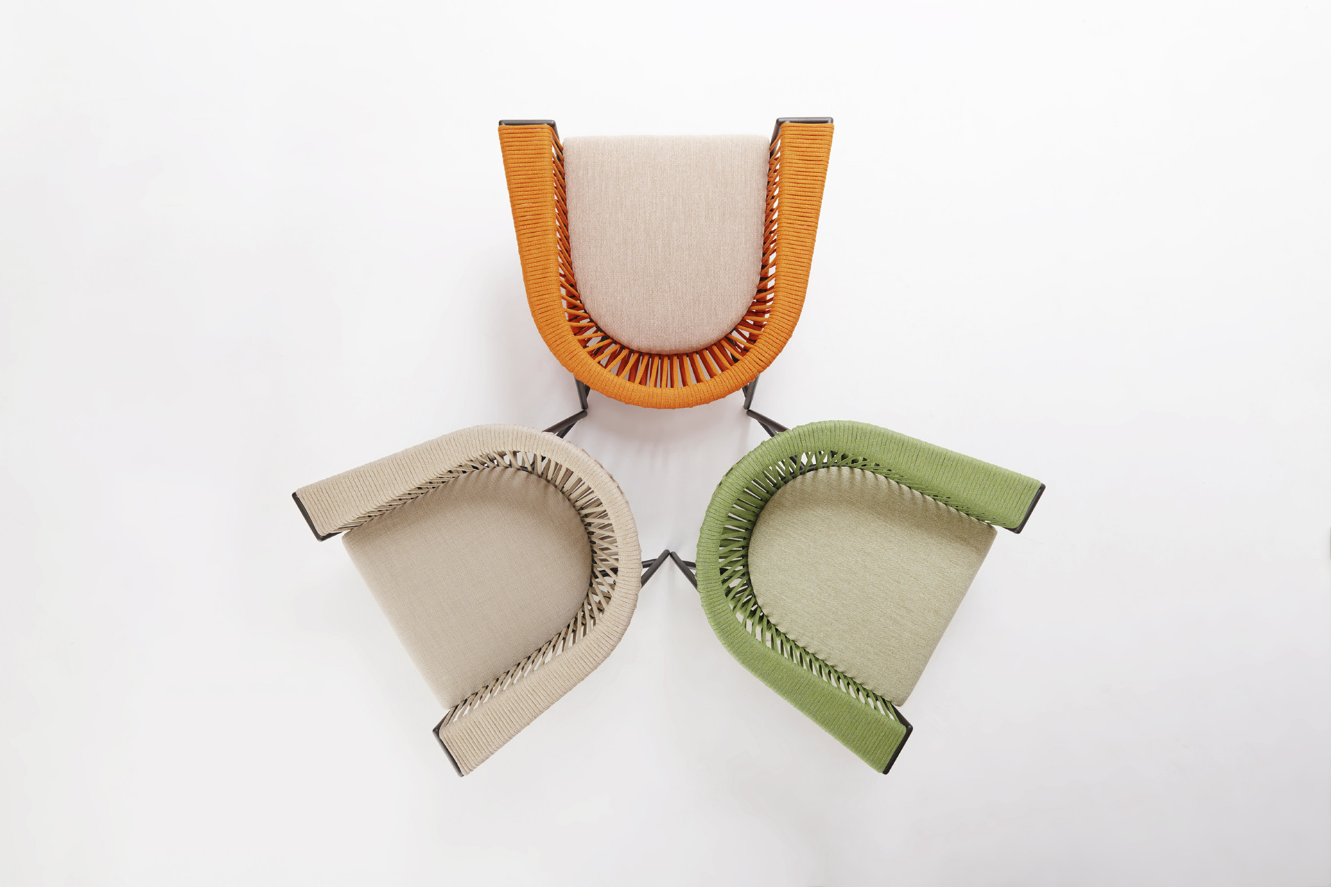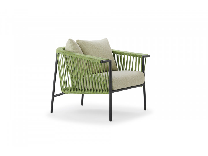 Poltrona in acciaio inox Aisi 304 verniciato a polveri, intrecciata in Oval Trendyrope. La particolare trama sdoppiata dell'intreccio e l'ampio bracciolo creano un design avvolgente, ispirato alla corolla di un fiore ed il comfort di seduta è straordinario grazie alle proprietà della corda ovalizzata ed alla cuscinatura. L'intera collezione è progettata sia per l'arredamento residenziale che per quello contract, sia per gli spazi outdoor che indoor.