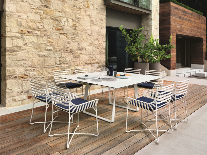 Tavolo in metallo verniciato a polveri con top in HPL. Lineare ed essenziale questo tavolo è valorizzato dalla preziosità dei materiali utilizzati. Resistente all’usura è un tavolo che bene si adatta all’arredamento di patii e terrazzi. Perfetto anche in un contesto interno come sale da pranzo o living. La sua versatilità rende questo tavolo ideale sia per gli arredamenti residenziali che per gli arredamenti contract.