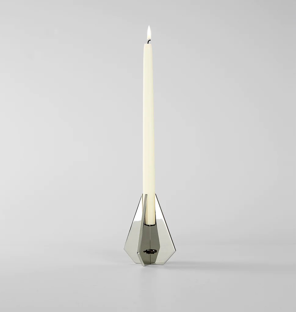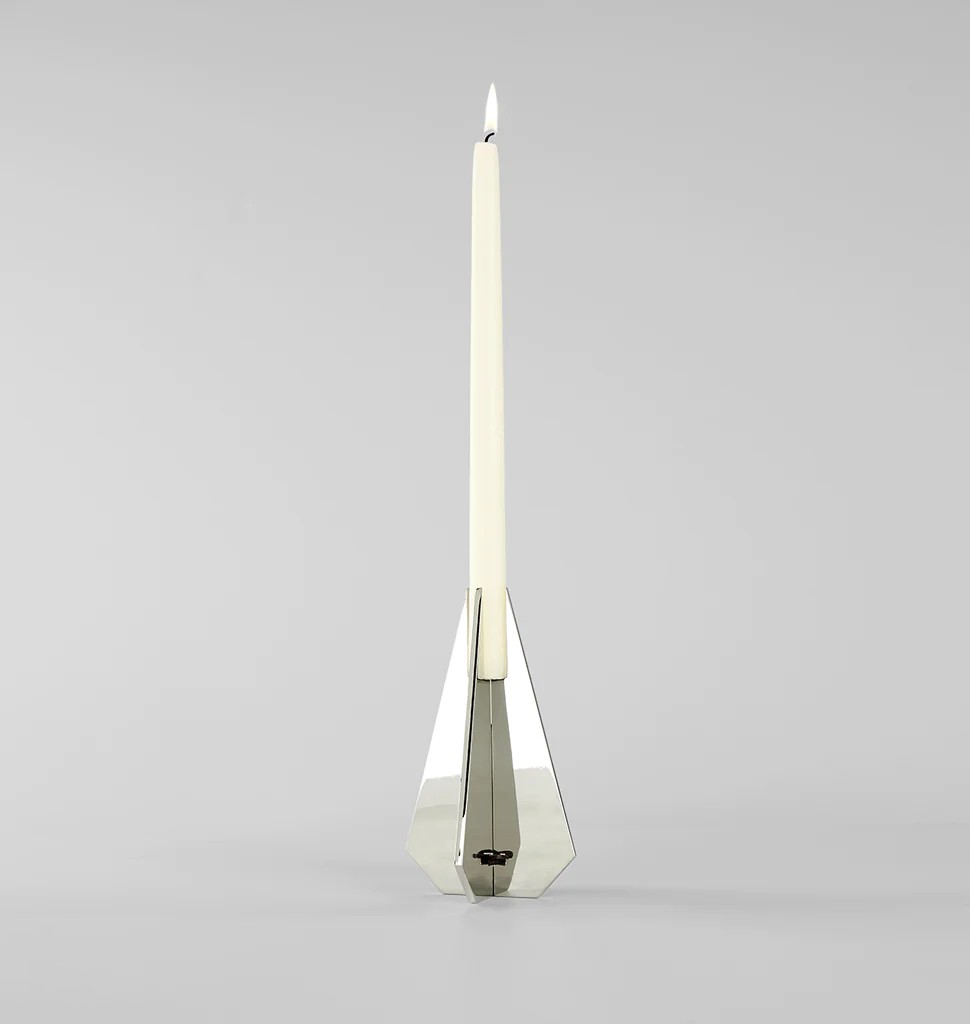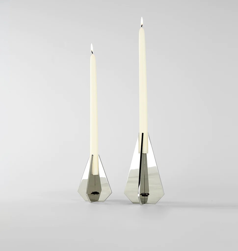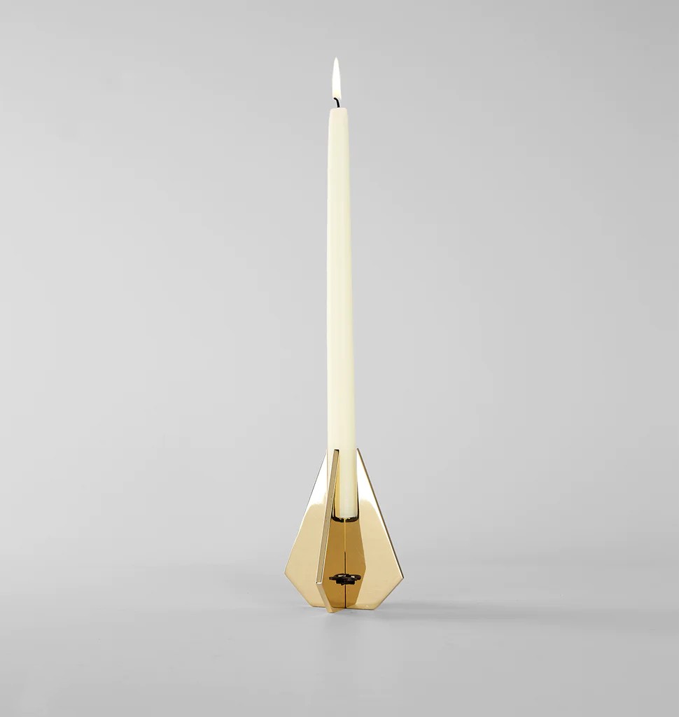 A two-dimensional shape, when crossed with another, becomes a three-dimensional object. This is the inspiration for a series of candlesticks by Bec Brittain, flat metal forms are interlocked and held together by a small leather keystone to create beautiful, functional objects.