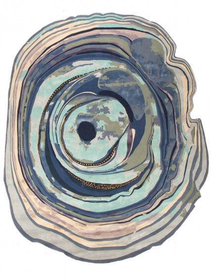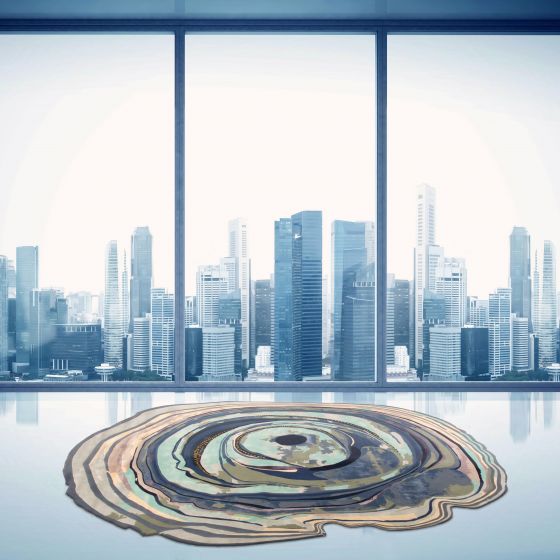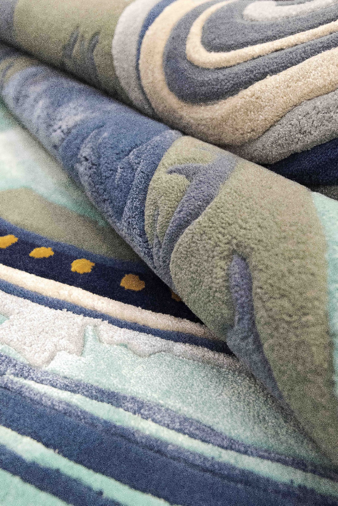 Agata Teal Blue is one of the exclusive limited edition luxury rugs part of Sahrai's Artists Selection designed in collaboration with David Elia and inspired by the mythical Brazilian Agate stone known for its uniqueness - no two Agate stones are the same. This design features spirals of differnt shades of blue stemming from an epi-center with splashes of golden dots covering the entire surface of the rug.