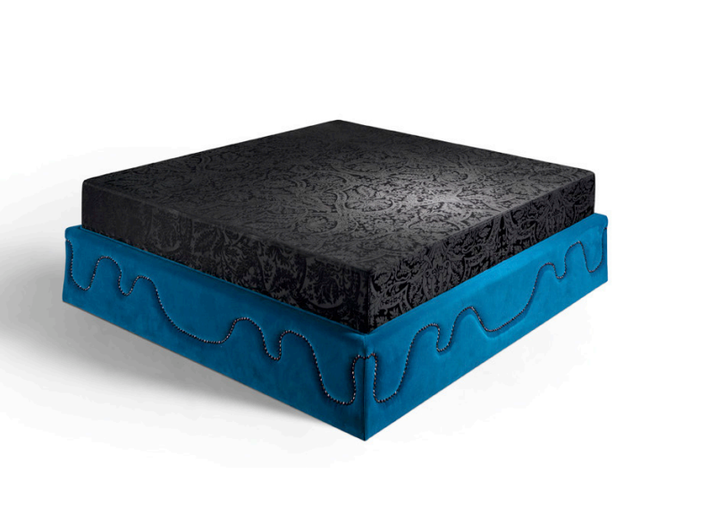 Ottoman in plywood and padded with polyurethane foam. Fabric or leather upholstery. Decorative bronze nails on sides.