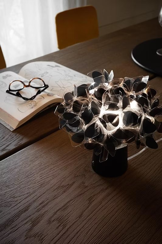 Clizia is a series of shapes fit together to create a perfect balance of reflections and transparencies. The lamp has taken note of natural forms, resembling a cloud that captures the first changing rays of morning sun, or a treetop filtering a play of light and shadows. All of the available versions marry aesthetics with functionality, featuring a magnetic system, connecting them to the ceiling (for the suspensions and applique) or the metal base (for the table and floor lamps). Clizia transforms a space into a landscape without overwhelming it.