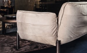 Poltrona imbottita fissa a densità differenziate, piedi in acciaio rivestiti in cuoio testa di moro, particolari in acciaio finitura antracite.