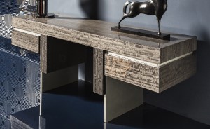 Consolle bi-facciale utilizzabile sia a parete che centro stanza, con cassetti. Presenta un inserto perimetrale in acciaio. Proposta nella nuova essenza di legno Eucalipto Frisè Grigio, ma disponibile anche n Piuma di Noce e Palissandro.